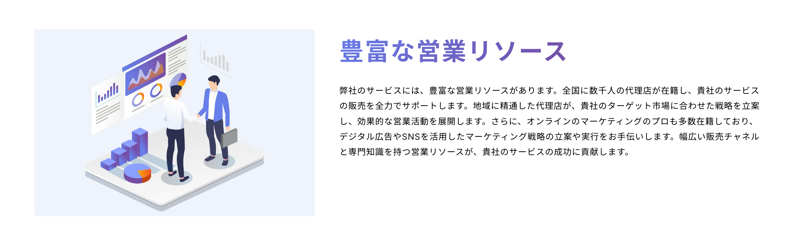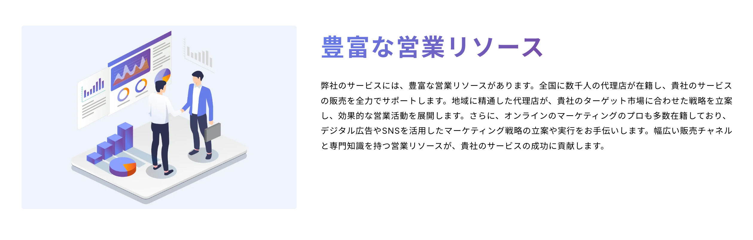 AIシステム開発、マーケティング、補助金申請、特許業務に関する専門家による手厚いサポートが特徴です。