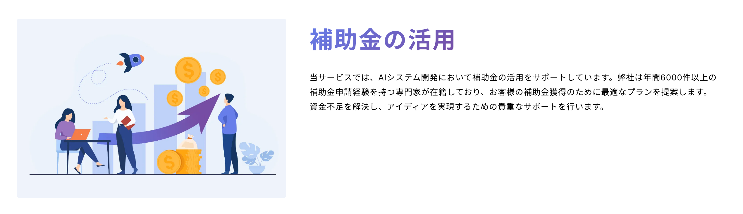 当サービスは補助金申請・AIシステム開発・システム販売までの一貫したサポートが特徴です。