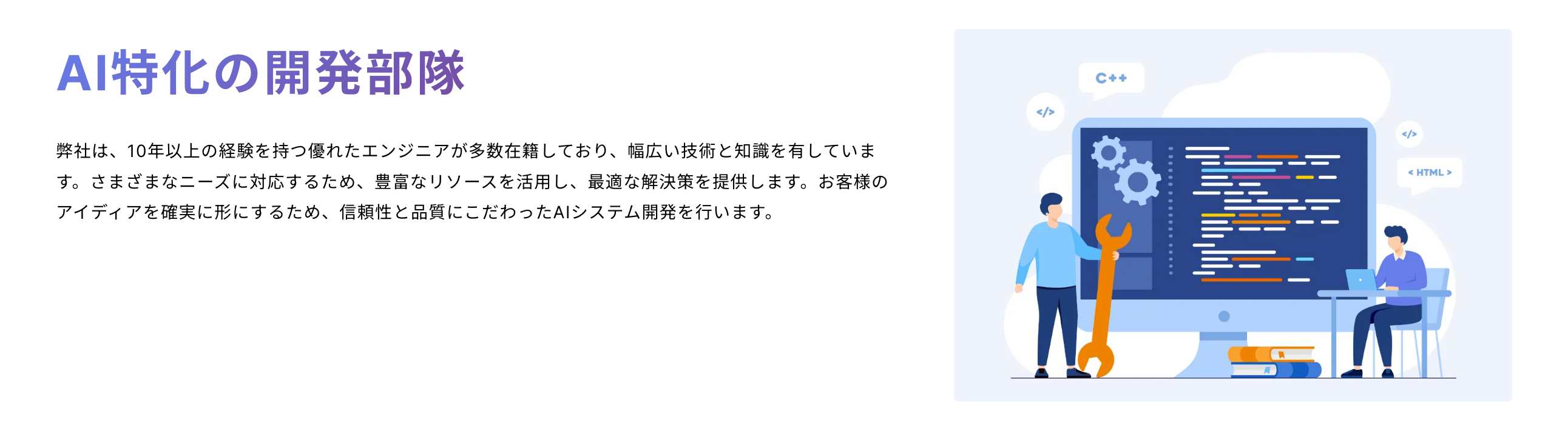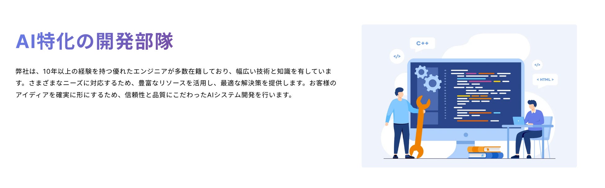 多領域に渡り、AIツール開発による業務効率化の事例・実績がある弊社がAI開発、販売とワンストップでサポートすることで、日本の中小企業の業務効率化や業績拡大に貢献します。