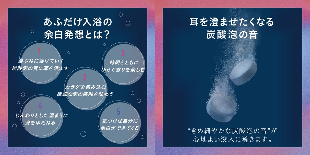 「あふだけ」は情報過多な現代だからこそ、“なにもしない、を、あえてやる”「余白時間」を入浴時に求めている若年層の実態に着目。同商品は、約10分間継続する炭酸泡の音や心地よい香りといった、ゆったりとした感覚に身をゆだねることで、ノイズとなる様々な情報をシャットアウトする “没入入浴”を促します。これにより生まれた「余白時間」によって、自身からあふれだすアイディア等に喜びを感じてもらうという、新しい入浴体験を提案いたします。このような従来の疲労回復に留まらない新しい入浴体験は「煙るバスルームで空になって 日々の最初の音を奏でよう」といった歌詞でも表現されています。新しい楽曲について「MAISONdes」管理人は「れんさんとmaeshima soshiさんのアイディアの結晶である楽曲をきっかけに、新たな物語が生まれることを楽しみにしています。」ボーカルを担当するれんさんは「Chillでオシャレな楽曲に仕上がりました。一人でリラックスして何も考えなくていい唯一の場所であるお風呂だからこそ、自分と向き合い新しいアイディアも浮かぶのではないでしょうか。」とコメント。また、作詞作曲を担当するmaeshima soshiさんは「湯船に浸かると、PCの前では出ない歌詞やメロディーが浮かんだ経験が何度もあります。この楽曲が皆さんの疲れを癒し、クリエイティブ創出のお役に立てたら幸いです。」と想いを語っています。