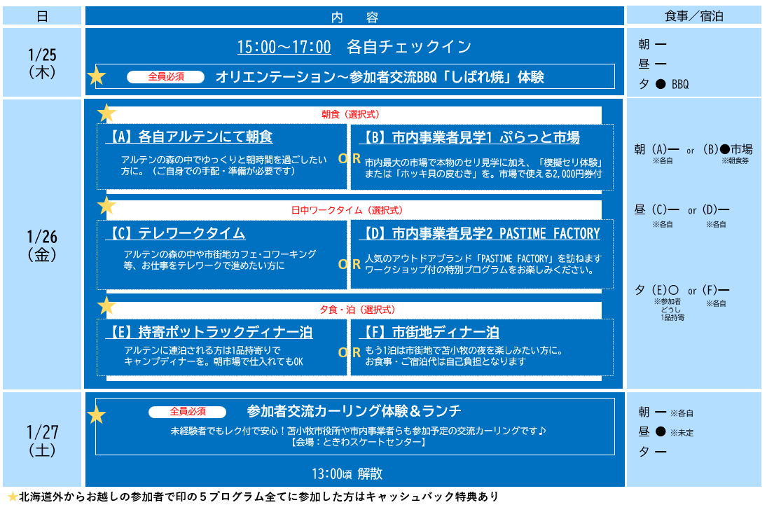 サウナ付温泉を備えるキャンプリゾートをプログラム拠点に、カーリング体験や雪中BBQのほか、市場や人気アウトドアショップを訪ねる体験型事業者交流などをご用意する本プログラム(最大定員10名)は、12月15日(金)正午まで先行抽選予約の受付を、同日13:00からは一般受付を、それぞれ以下のWEBサイトにて行います。最大4万円のキャッシュバック特典の適用条件など詳細については、各申込ページ等にてお確かめください。