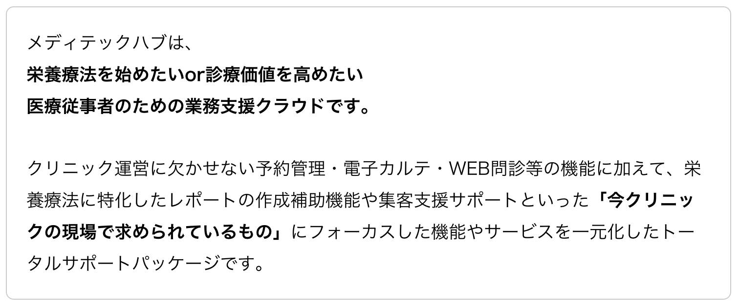 クリニック運営に欠かせない予約管理・電子カルテ・WEB問診等の機能に加えて、栄養療法に特化したレポートの作成補助機能や集客支援サポートといった「今クリニックの現場で求められているもの」にフォーカスした機能やサービスを一元化したトータルサポートパッケージです。