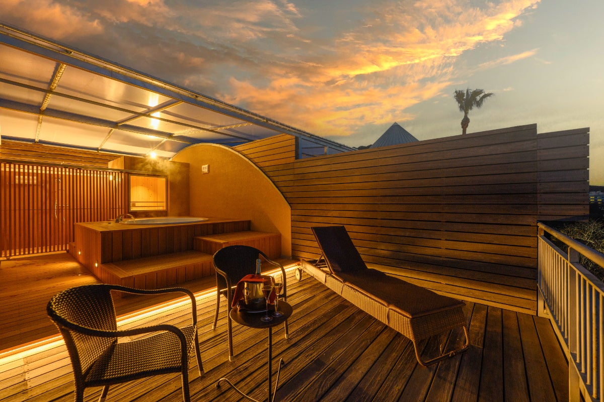 2023年の「本館モアナコーストの全室プライベートサウナ付きリニューアル」に続き、2024年は「別館離れヴィラベルトラモントの全室プライベートサウナ&プライベートデッキ&専用水風呂付きリニューアル」を実施、これに伴い日本初*の全室にプライベートジェットバス(露天風呂/半露天風呂)・プライベートサウナが付いたメゾネット客室に生まれ変わりました。