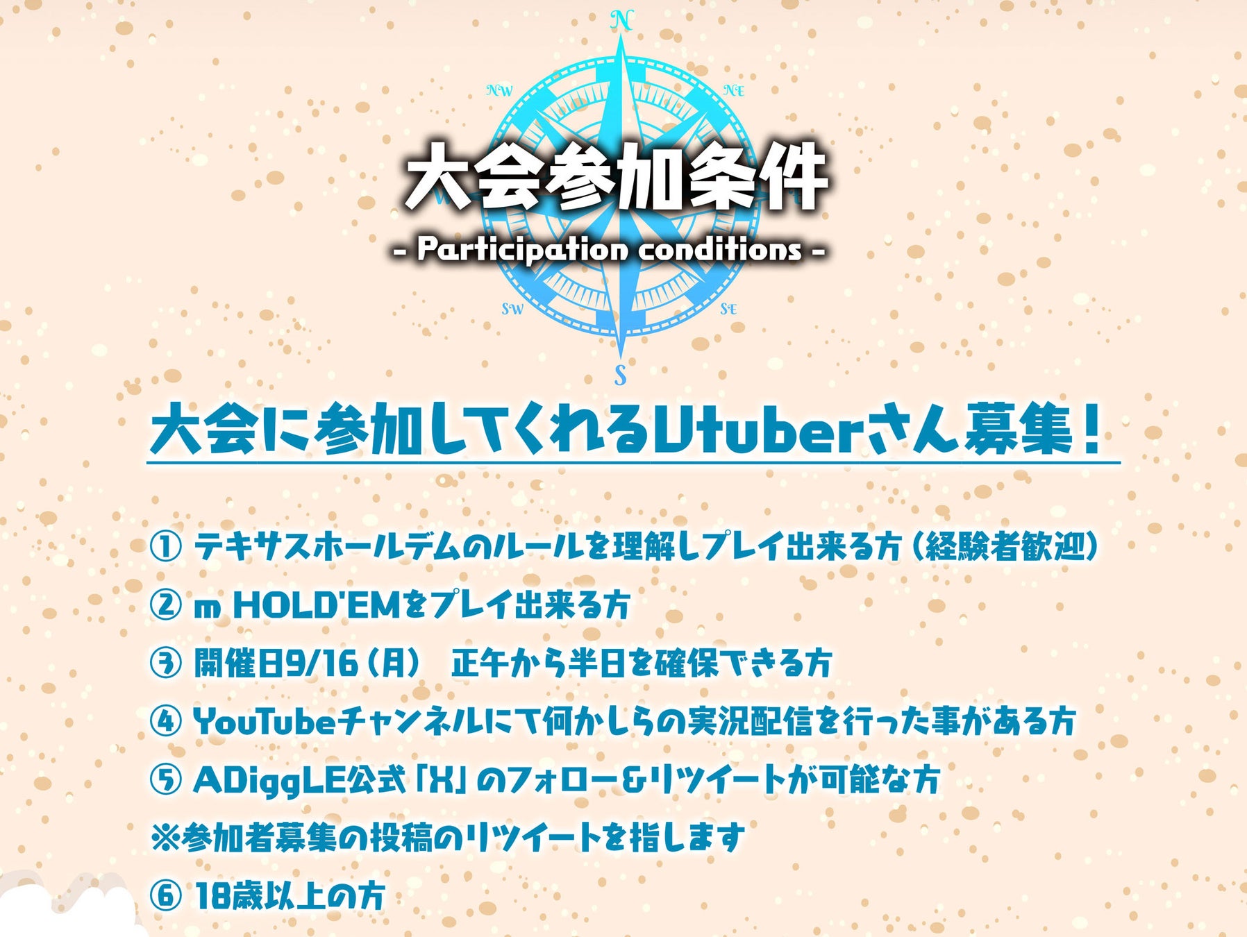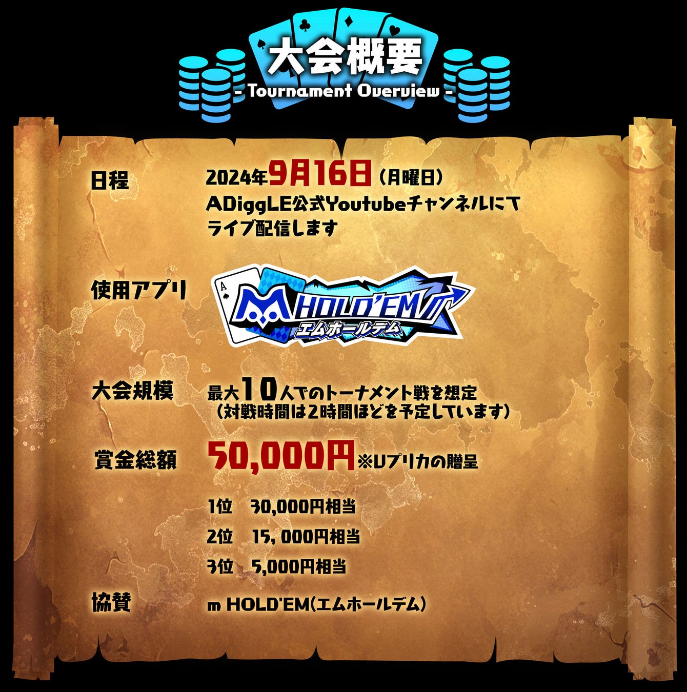 我こそはVtuberナンバー1ポーカープレイヤーだ!と思う方、大会を盛大に盛り上げてくれる方、これから大会に向けてポーカーを始める方、様々なVtuberさんのエントリーを待ってます!