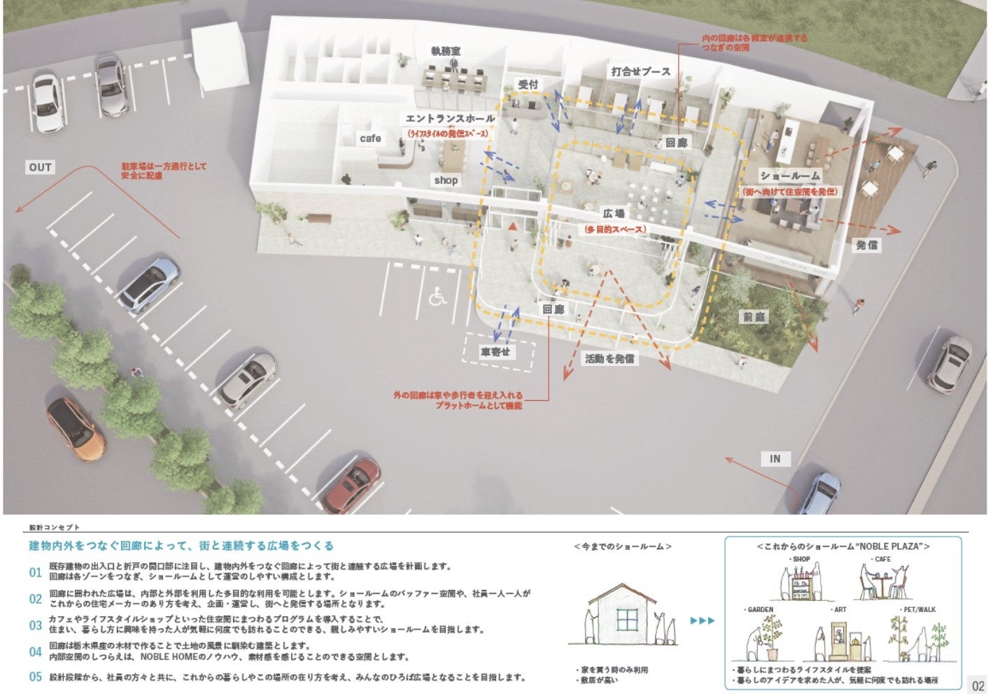 この提案は、対外的に「どのようにノーブルホームという会社をアピールし、魅力を伝えていくか」というのがより考えられた作品でした。中と外を繋げる・繋がるショールームから、この宇都宮の地がより発展することを願っています。