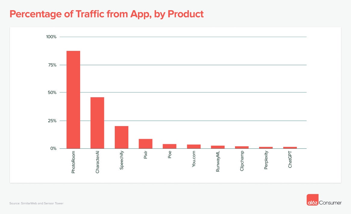 理由としては、多くのAI開発企業は小規模なチームで構成されており、消費者へのリーチを考慮した場合、自社のリソースと焦点をWeb、iOS、Androidに分散させたくないという考えがあると推測できます。結果として、ランキング内で現在モバイルアプリを提供している企業はわずか15社のみとなります。