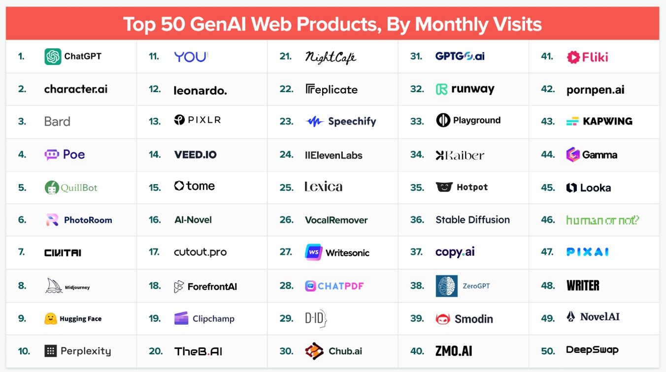 アンドリーセン・ホロウィッツは米国を代表するベンチャーキャピタルで、“消費者がどうAI生成技術を活用しているのか?”というテーマのもと、生成AIサービスの月間アクセス数ランキングを2023年9月13日に発表しました。