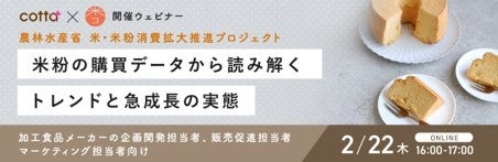 今回のウェビナーでは、そんなトレンドである米粉の実態を、cottaの購買データより徹底解説します。他社との差別化や、新たな市場の開拓に繋げる糸口として、最新トレンドを抑えておきたい方や、商品開発に活かしたい方などに聞いていただきたい内容です。ぜひお気軽にご参加ください。