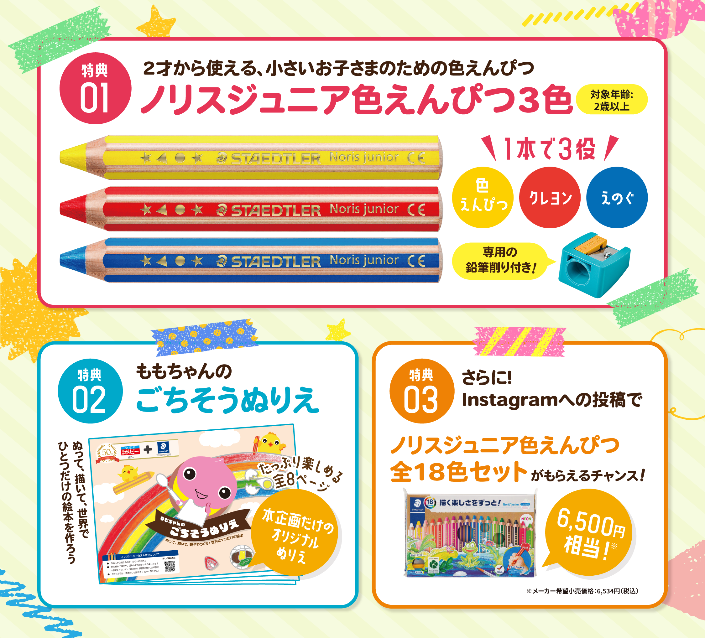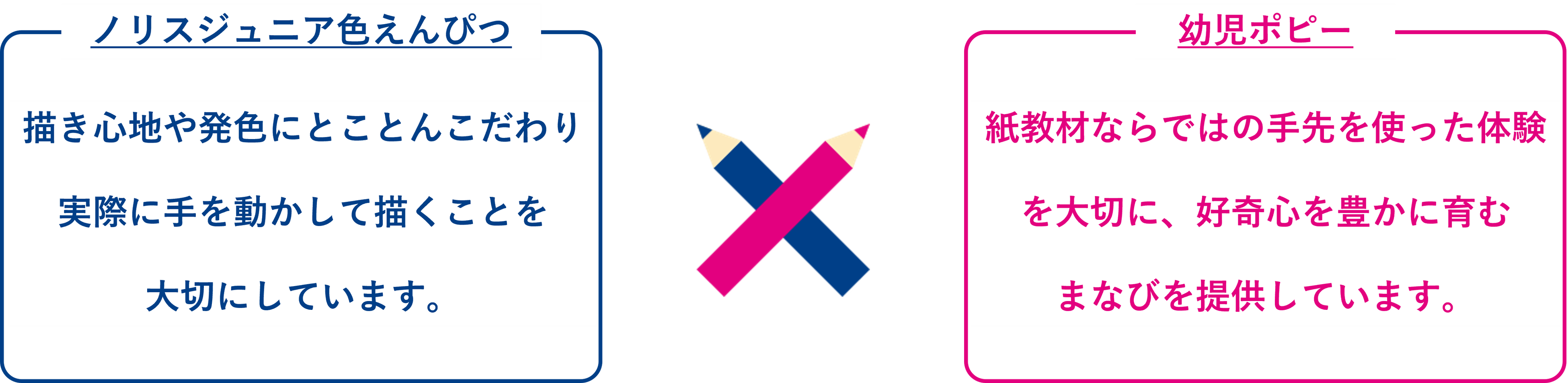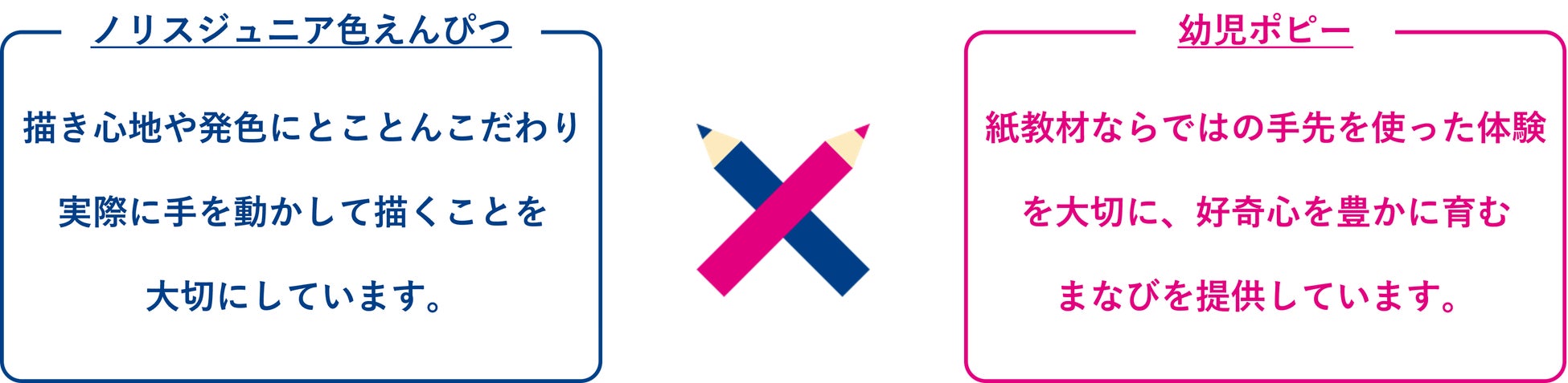 こうした、幼児期での書くことへの期待が益々高まる中で、「お子さまが実際に手を動かすことで得られる学びを大切にしたい」「タブレット学習ではなく、お子さまに『描く楽しさ』や『達成感』を存分に味わってほしい」という理念共感から、今回、共に50周年を迎える「幼児ポピー」と「ステッドラー日本(ノリスジュニア色えんぴつ)」のコラボレーションが実現いたしました。