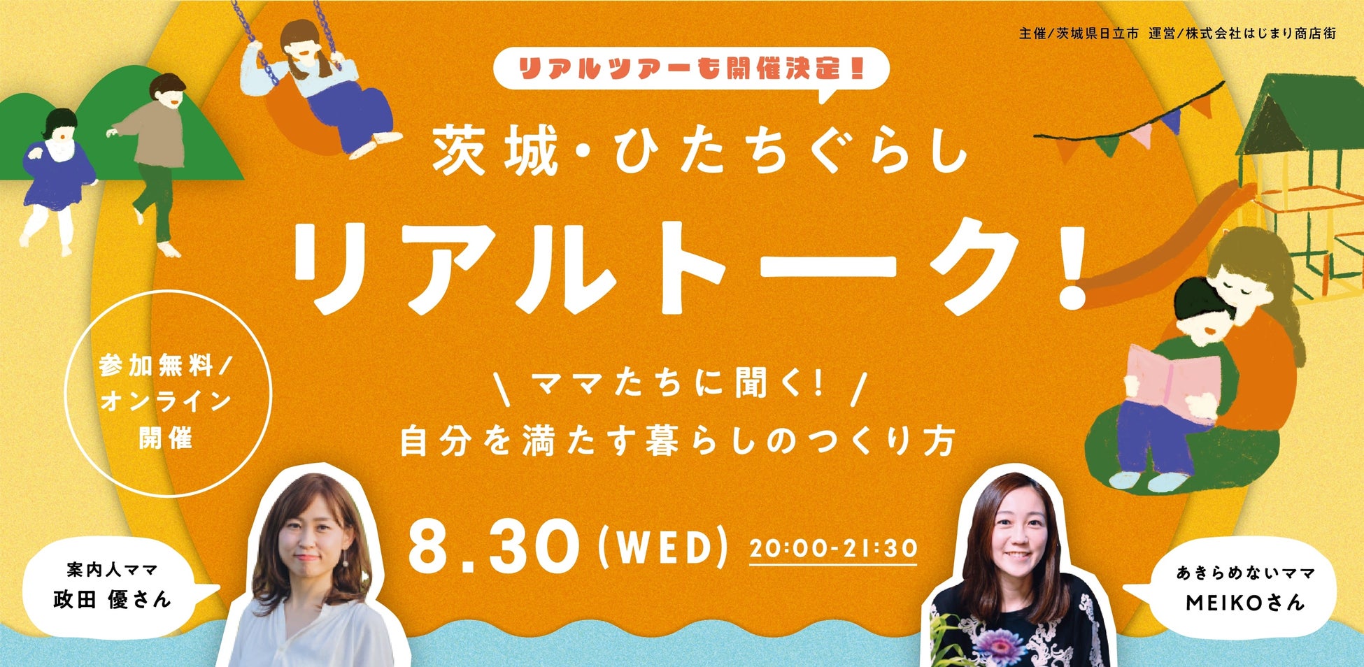 第1弾のオンラインイベントでは、日立市に移住・Uターンをした“パワフルママ”お二人をゲストにお呼びし、日立市への移住・Uターンに至るきっかけや、暮らしてみて分かった日立市の魅力、子育てに関するあれこれなど、わくわくだけでなく、不安も含めた「ひたちぐらし」のリアルを伺っていきます。