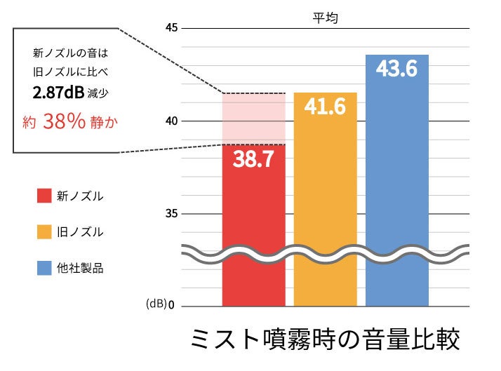 これにより従来品と比べて噴霧時のノイズが約38%減少し、ミストの質がさらに安定します。
