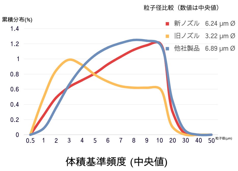 新ノズルは旧ノズル比で粒子径が大きいものの、個体差が旧ノズルよりも少なく、ミストの質が安定しています。