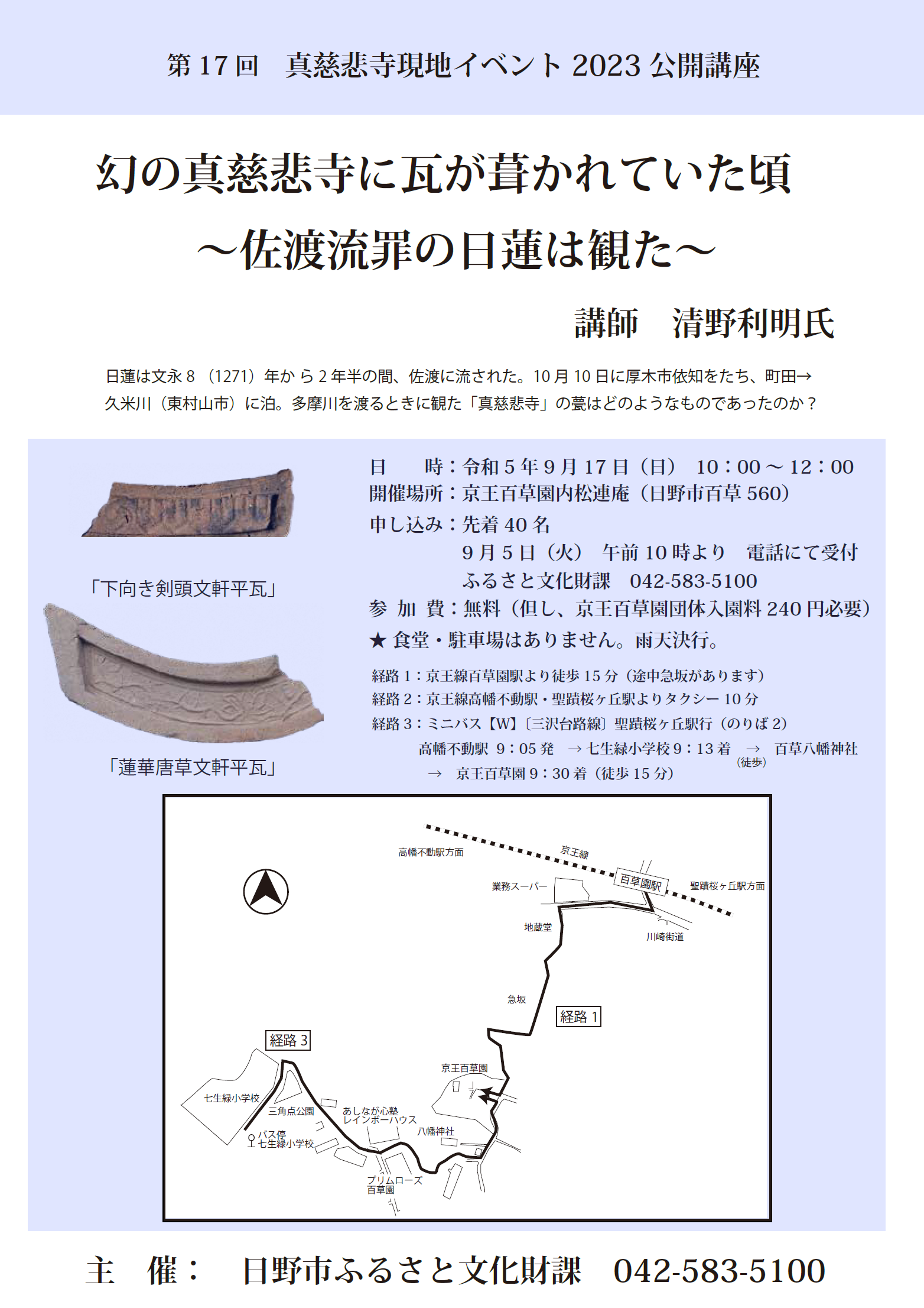 「真慈悲寺」は、中世の歴史書『吾妻鏡』に登場する大寺院です。平成元年に真慈悲寺が日野市百草の地にあったことを決定的に証拠づける5000点近い中世瓦が京王百草園で出土しました。それから実に34年も経った今年、新たに隣地の百草八幡神社境内から全く異なるタイプの瓦が発掘されたことは驚くべき発見でした。この発見を契機に、今回新たな切り口から真慈悲寺について考えてみる機会とします。合わせて、コロナ禍で一般公開が中止となっていた百草八幡神社に伝来の国指定重要文化財「銅造阿弥陀如来坐像」が4年ぶりに公開されます。その背銘には「真慈悲寺」を含め多くの文字が刻まれており、真慈悲寺の歴史的背景を語る重要な手がかりとなっています。 ぜひ、講座と公開を合わせて歴史ロマンを一日堪能してはいかがでしょうか。