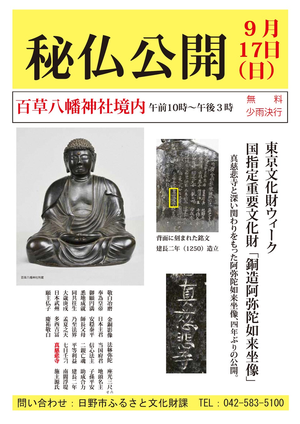 申し込み:公開講座は要申し込み(先着40人)。9月5日(火)午前10時から日野市ふるさと文化財課(電話042‐583‐5100)へ電話※阿弥陀如来公開は申し込み不要。
