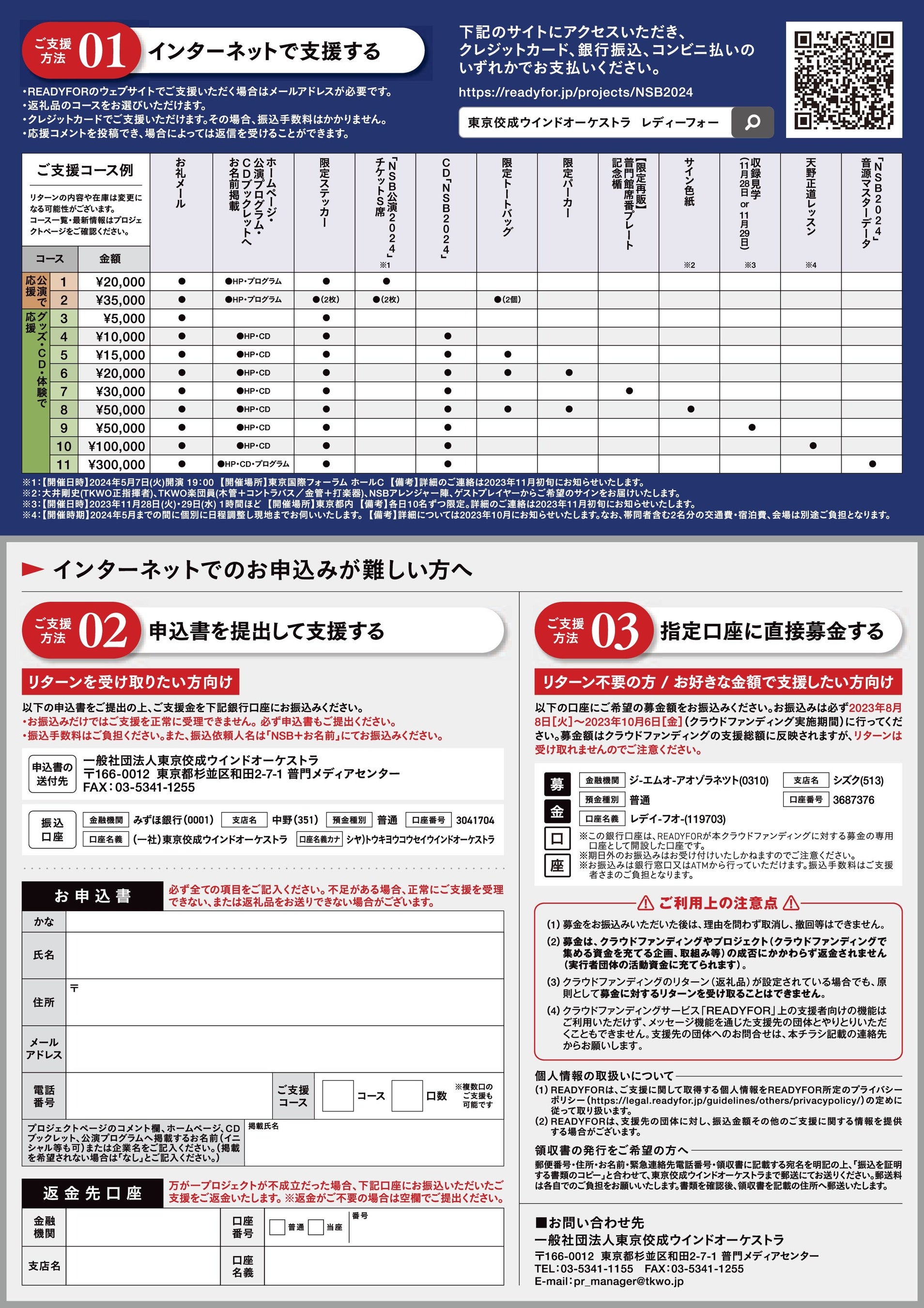 「NSB2024」CD(クラファン限定ジャケット)、「NSB公演2024」S席チケット(先行販売)、特別レッスンや出張公演など