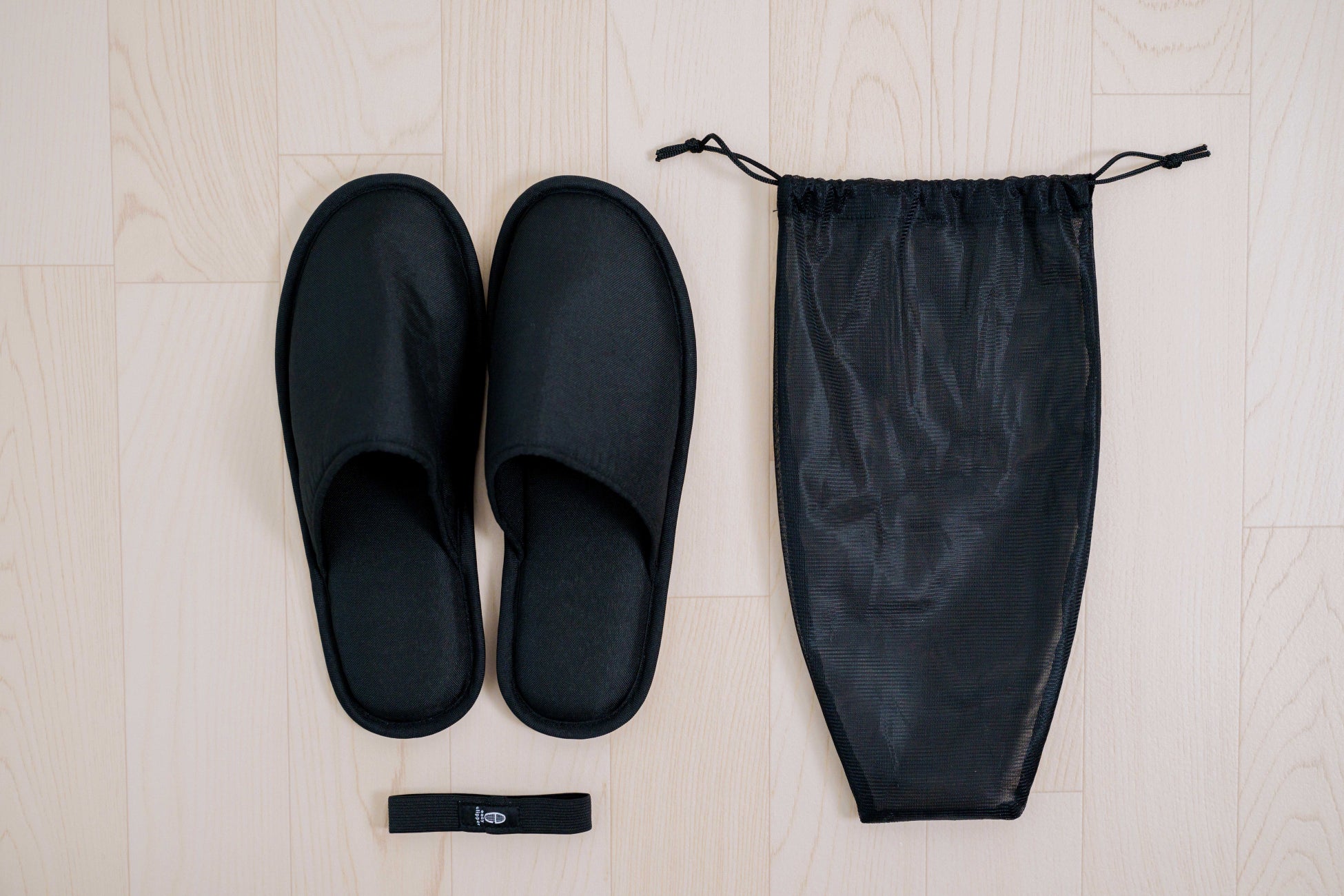 「イージースリッパパッカブルヒール付き」は、持ち運びできる利便性と外出先での快適性、収納にも便利で、スリッパをしっかりホールドしながら洗濯機で洗える袋が付いた携帯スリッパです。