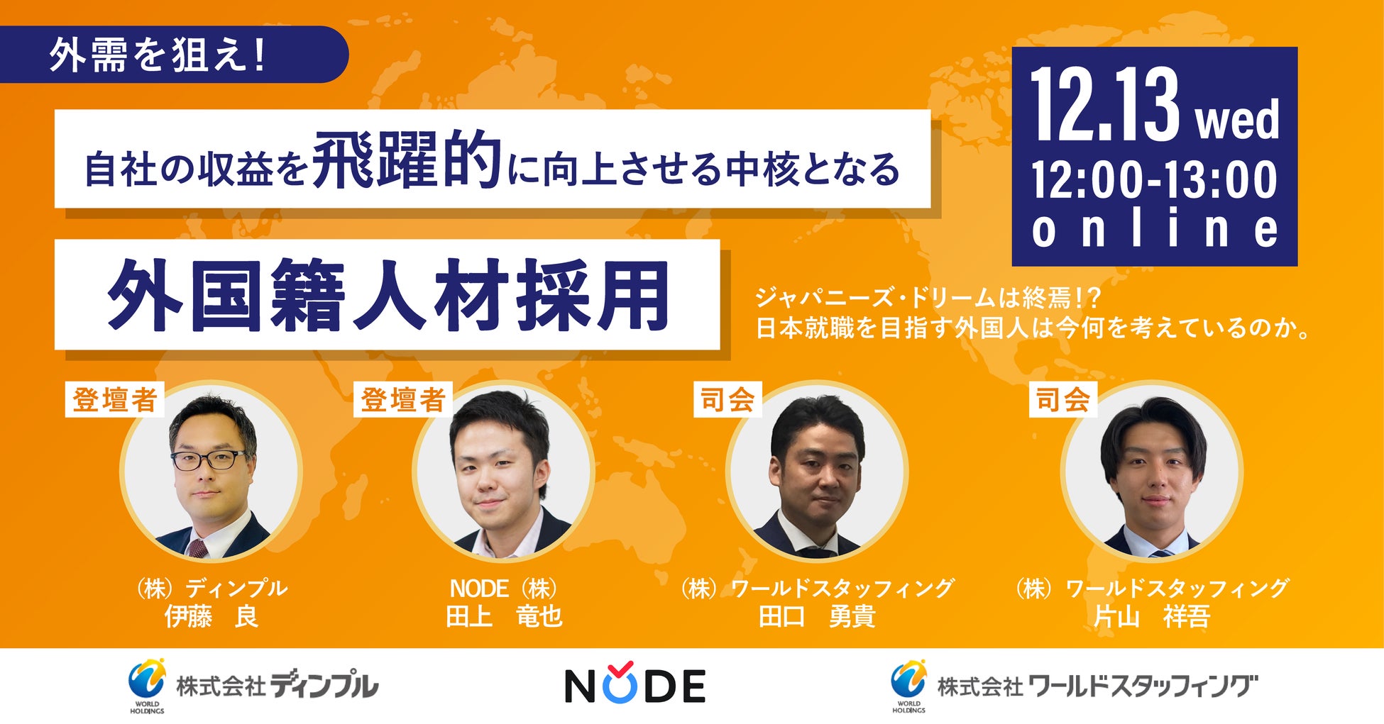本セミナーでは日本全国にて多数の外国籍人材の就労支援実績がある株式会社ディンプル様より「外国人採用・雇用のトレンドとポイント」を解説すると共に、全国の企業様へ外国籍人材の紹介及び人材紹介会社向けの推薦、スカウトプラットフォーム「Sunrise」を運営するNODE株式会社様より「外国人雇用は売上アップにつながる」をテーマに深堀していきます。