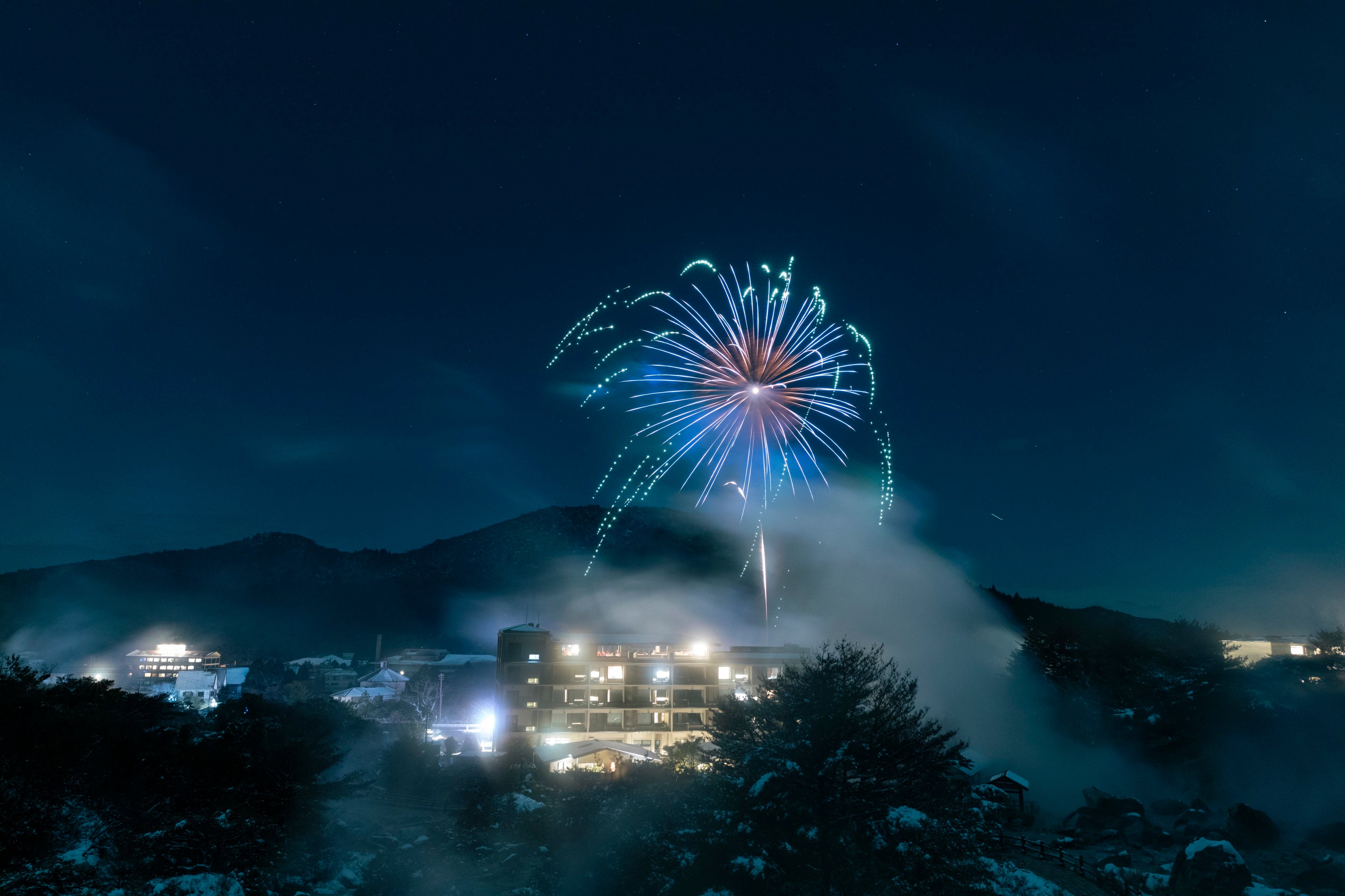 ● 湯けむり × 光 × 冬花火