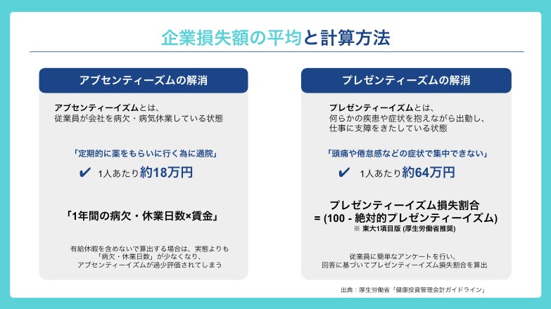 特に、アブセンティーズム(欠勤状態)とプレゼンティーズム(生産性低下状態)は、企業にとって大きな負担となります。