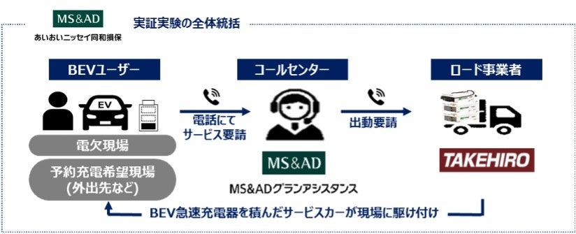 MS&ADインシュアランスグループのあいおいニッセイ同和損害保険株式会社(代表取締役社長:新納 啓介)、MS&ADグランアシスタンス株式会社(代表取締役社長:渡辺 敏男)、株式会社タケヒロレッカー(代表取締役:武岡 謙二郎)、Bell Energy株式会社(代表取締役社長:鈴木 勝蔵)は、トヨタ・レクサスBEV※1の一部ユーザー向けに、BEVの普及・拡大を見据えた充電サービスの実証実験を9月から実施します。
