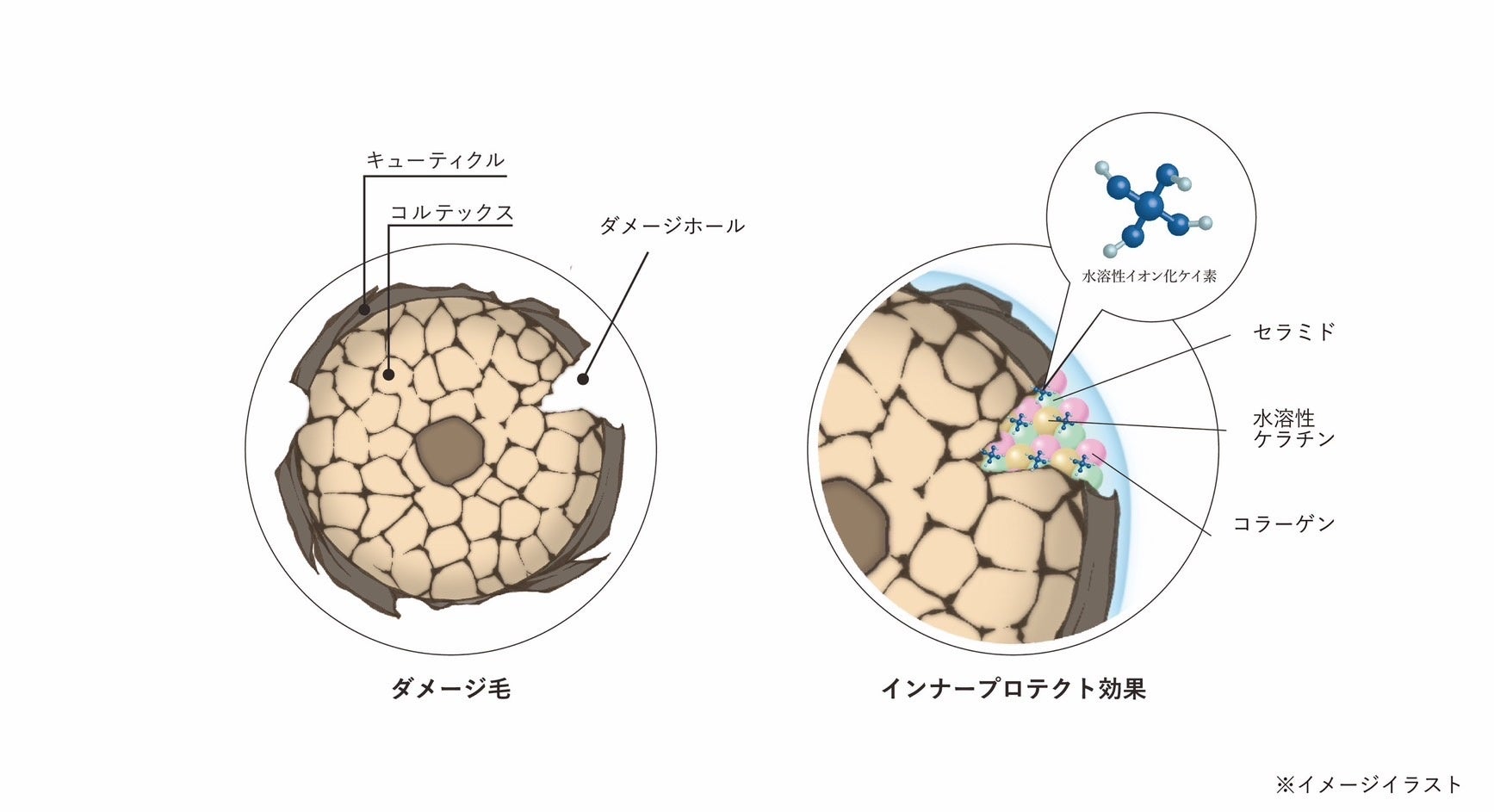 「INITIAL SERIES PLASMA SILICA」の核心成分である「PLASMA SILICA」は、特殊なプロセスによりナノ化された水溶性イオン化ケイ素を含んでいます。この成分は、コラーゲンやセラミド、ヒアルロン酸などの保湿成分と結合し、髪と肌に深い潤いをもたらします。また、成分を強化することで、より持続的な保護効果の発揮が可能となりました。この「インナープロテクト作用」により、髪本来の美しさが蘇ります。