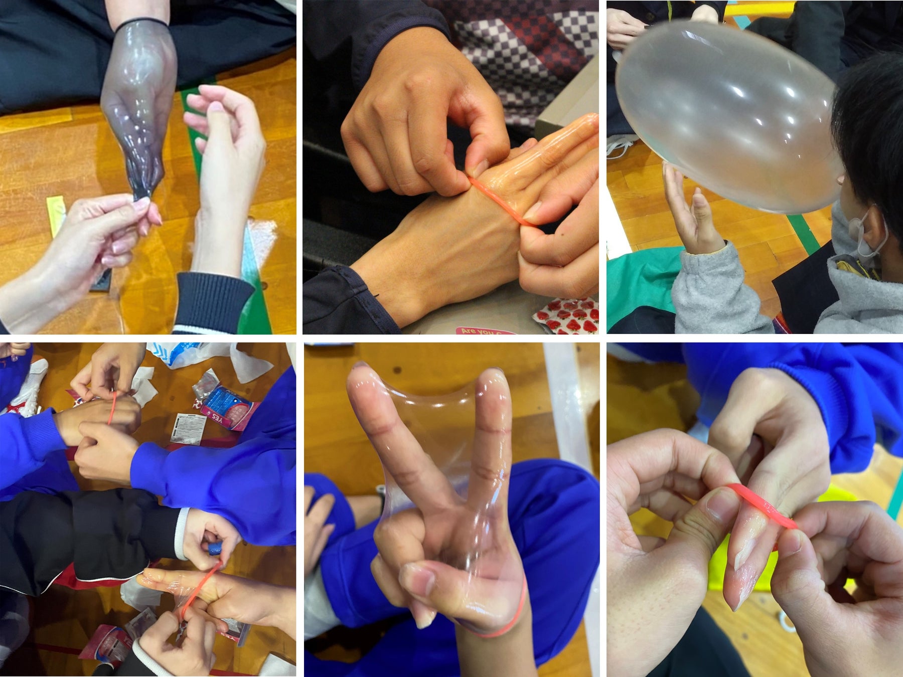 『びわこんどーむ』が登場する講演会や授業の終盤には、約20~400名/回の中高生がペアで一斉に手指にコンドームの装着練習をする光景が広がります。同性の2人組でコンドームに触る体験学習は、ヌメヌメの感触に驚いたり、ゴムの匂いに反応したり、裏表を間違ったりと終始にぎやかな様子です。復習後の2回目の装着はスムーズになり、最後には膨らませて爪で破るなどして伸縮性や耐久性などの構造や役割を理解します。