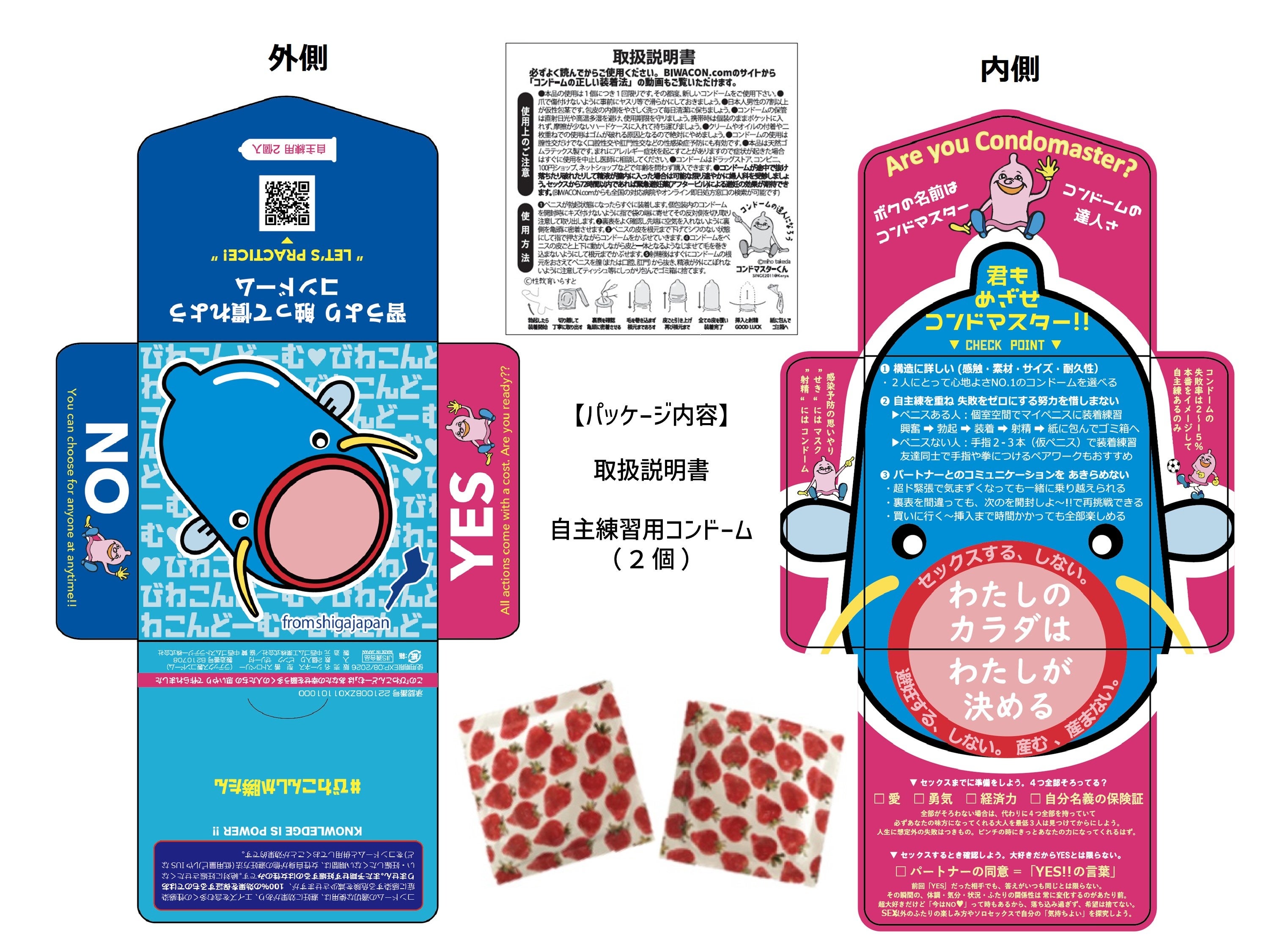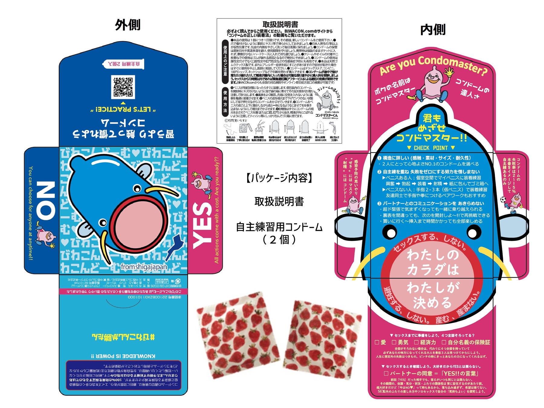 性や人権に関する基礎知識やコンドームの達人になるためのポイントなどが約2,000字にわたり印字され、自主練習用コンドーム2個(イチゴの香り付/本番使用可能)と取扱説明書が同封されています。