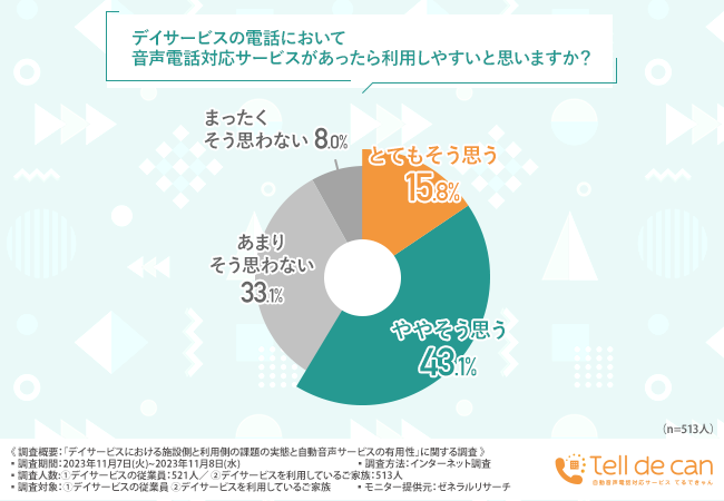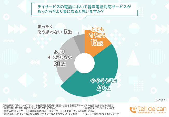 そこで今回、高齢者向け自動音声電話対応サービス『Tell de Can(てるできゃん)』(https://prd.tell-de-can.com/)を提供する株式会社アルティジャーノコネクティングは、①デイサービスの従業員/②デイサービスご利用のご家族を対象に「デイサービスにおける施設側と利用側の課題の実態と自動音声サービスの有用性」に関する調査を実施しました。