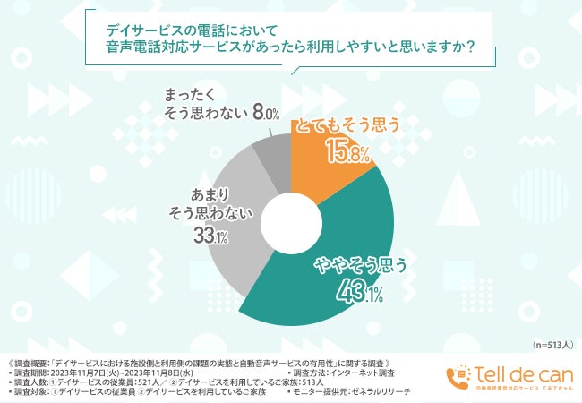 そこで、音声電話対応サービスについてどう思うか質問したところ、約6割の方が、デイサービスに音声電話対応サービスがあれば利用しやすいと回答しています。