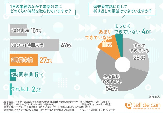 電話対応にかかる時間は30分~1時間が最も多い。留守番電話を確認できている方の割合とは
