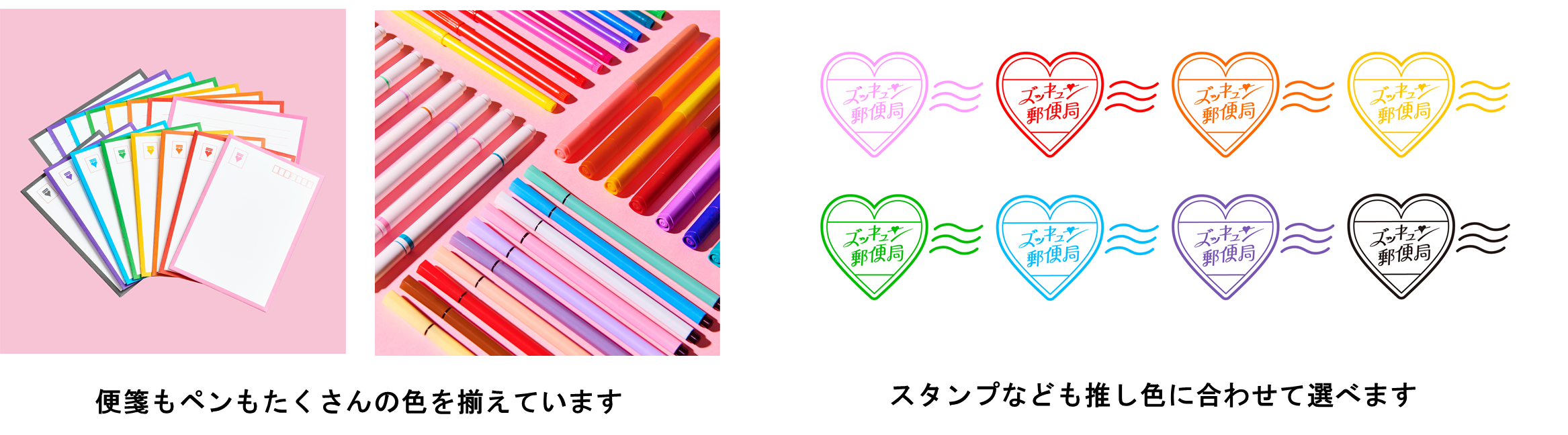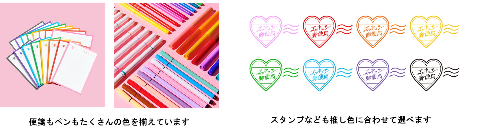 郵便局に馴染みのない若い世代を対象としたかわいいコンテンツを多数用意しています。ふだんは言えない想いを届ける「ドッキン♡ハートレター」、撮影した写真が切手になる「ズッキュン♡切手プリ」、自分の好きな色の便箋・ラッピングを自由に選べて推し活もできる企画、人気イラストレーターとのコラボをはじめとしたグッズ販売、「ズッキュン♡ドリンク」のプレゼントなど、これまでにない郵便局をお楽しみいただけます。