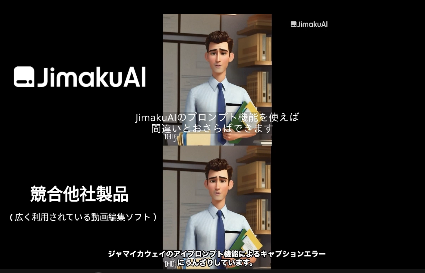 JimakuAIは、これまで人の手で行っていた動画の文字起こしから翻訳、字幕生成に至るまで自動で行うことができ、コスト削減や省力化に貢献するサービスです。