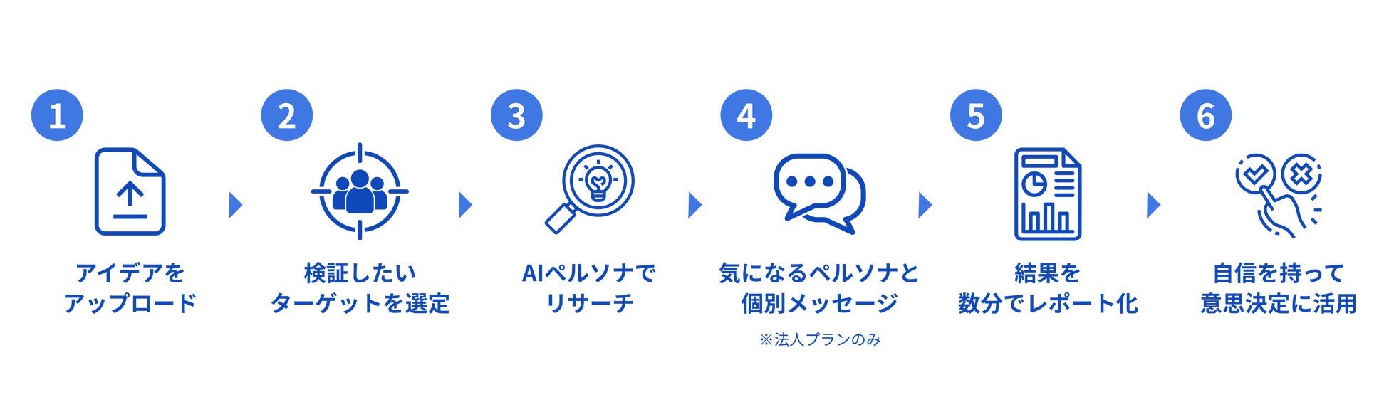 アイデアのアップロードからレポート取得まで、わずか5分。調査会社なら数週間かかっていたプロセスを劇的に短縮します。 -