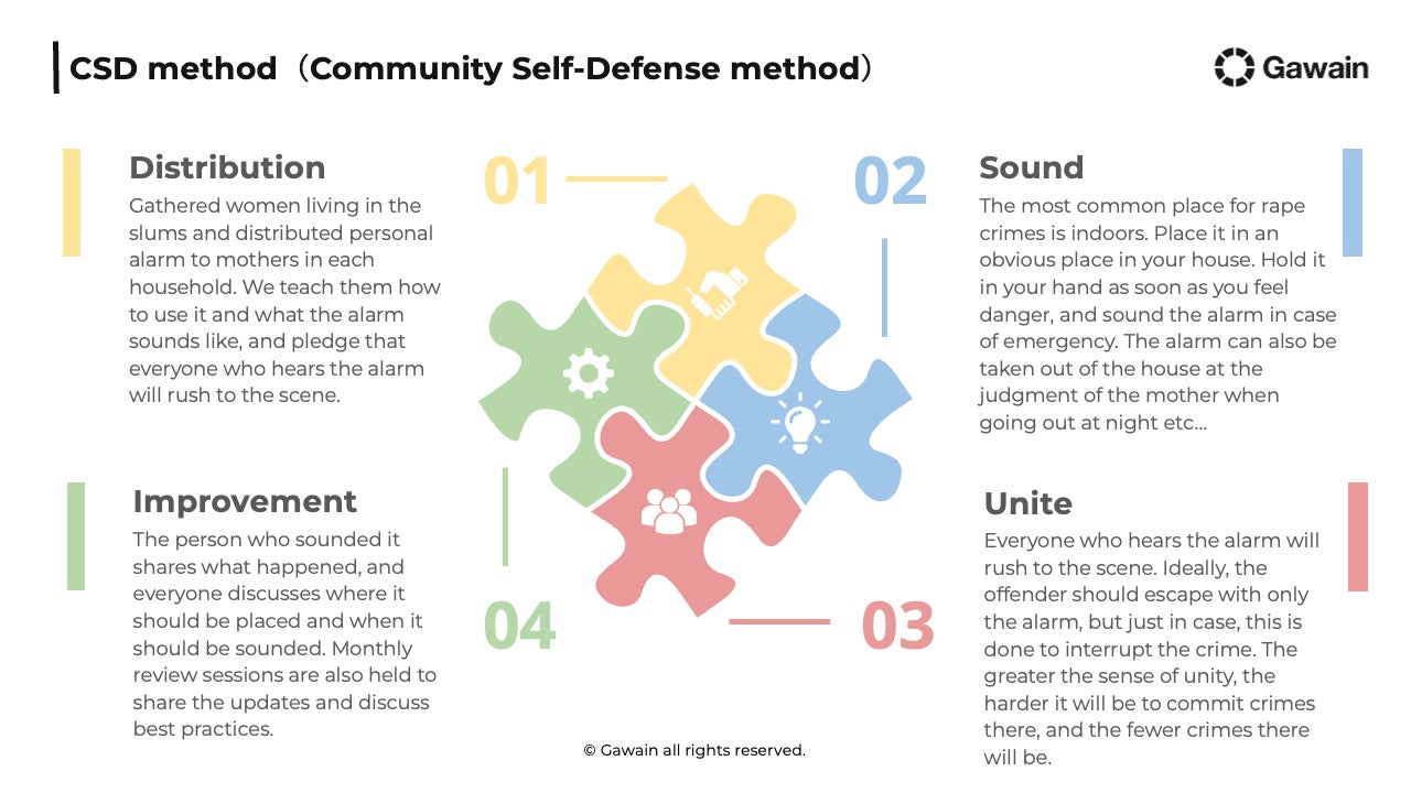 コンセプトは「Band Together(全員で団結して守り合う)」。各家庭の女性に防犯ブザーを配布し、緊急時に音で危険を周囲に知らせ、全員がその場所に集まることでレイプ・性犯罪を予防・中断させる取り組みです。CSDとは、コミュニティセルフディフェンスの略で、”スラム街の環境特性”と”音”との親和性に着目し、防犯ブザーをトリガーに自己防衛(セルフディフェンス)を組織化したGawain独自のメソッドです。言葉が話せなくても、誰でも、いつでも、どこでも導入できるように、極限までシンプルな運用にデザインしております。