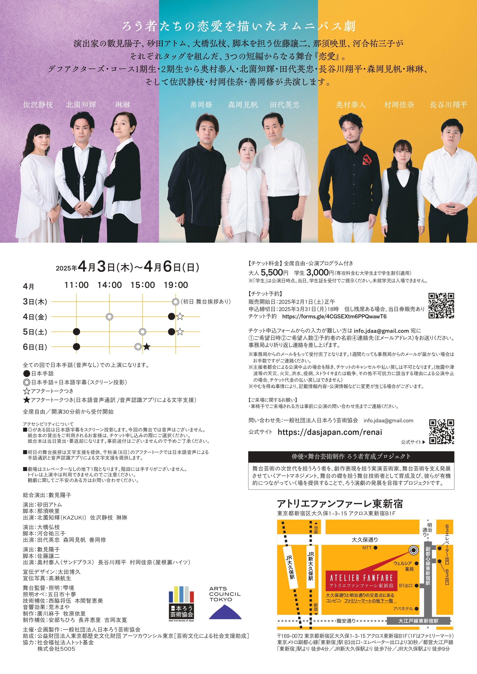 2025年春、恋愛という普遍的なテーマを3つの視点から描く、ろう当事者たちによるこの公演にぜひご注目ください。