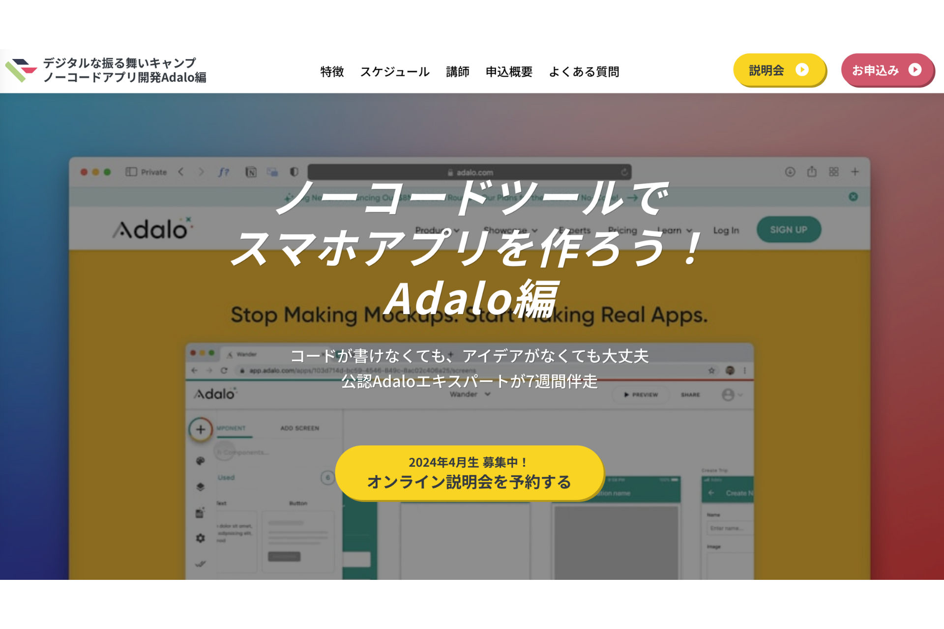 【2024年4月9日開講】「デジタルな振る舞いキャンプ ノーコードアプリ開発Adalo編」プログラミング言語を使わずアプリを作るスキルを身につける、7週間でノーコードツールAdaloをマスター