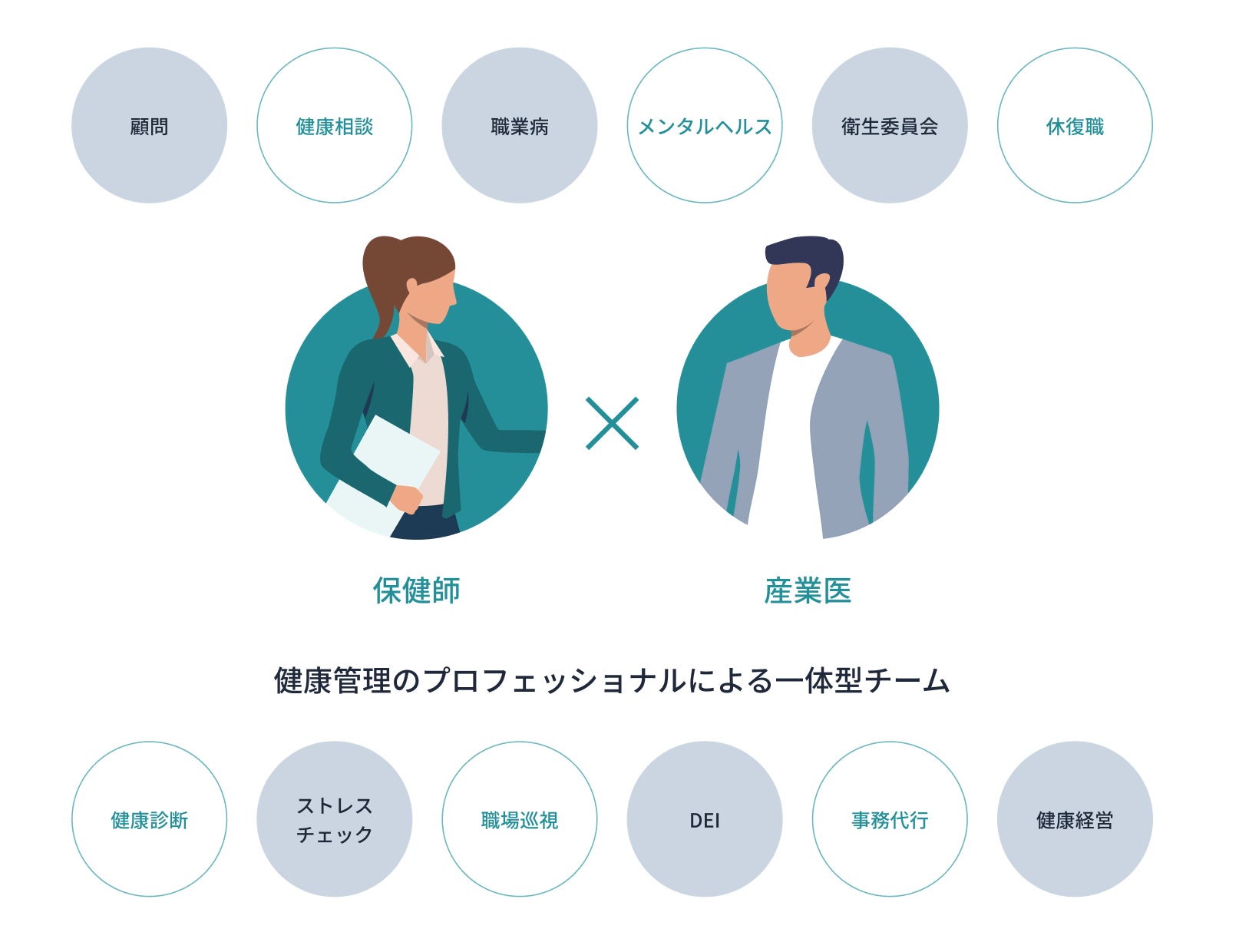現在お悩みの課題解決から未来を見据えた体制づくりまで、保健師と産業医の一体型チームが健康管理のよきパートナーとして伴走します。