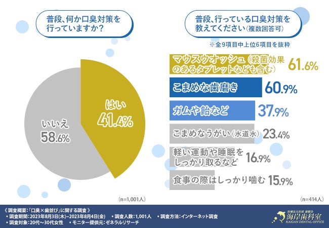 「普段、何か口臭対策を行っていますか?」と質問したところ、4割以上の方が『はい(41.4%)』と回答しました。具体的には、どのような対策を行っているのでしょうか。