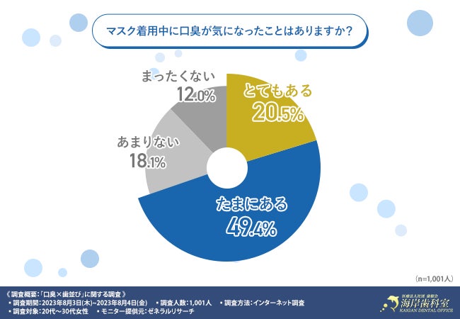 「マスク着用中に口臭が気になったことはありますか?」と質問したところ、『とてもある(20.5%)』『たまにある(49.4%)』とおよそ7割の方が、マスク着用中に口臭を感じたことがあると回答しています。