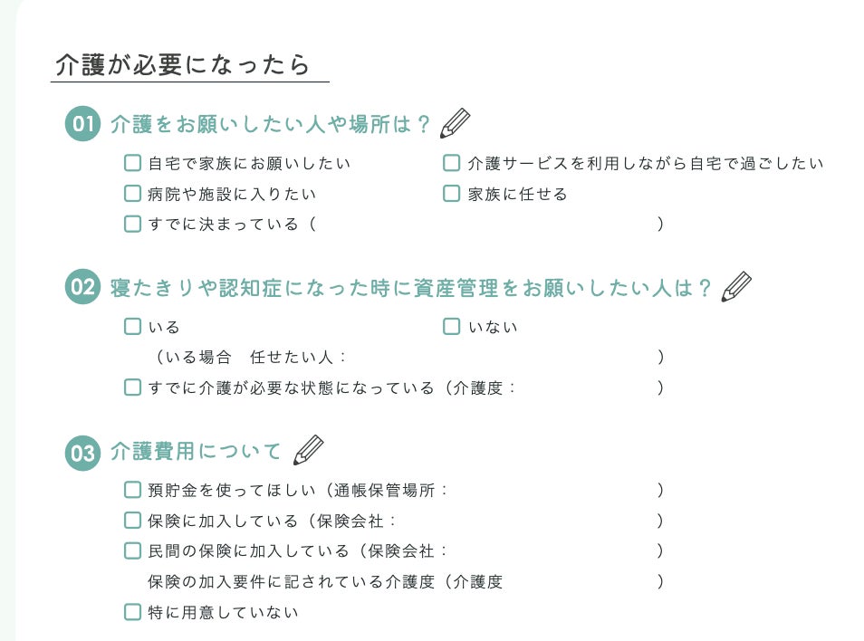 従来のエンディングノートのように詳細な記述式ではなく、チェックリスト形式を中心にしているため、取り組みやすさが大きく向上しています。重い気持ちになりがちな終活を、まずは気軽に始められる構成です。