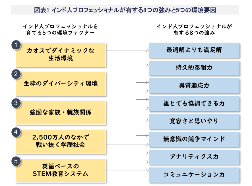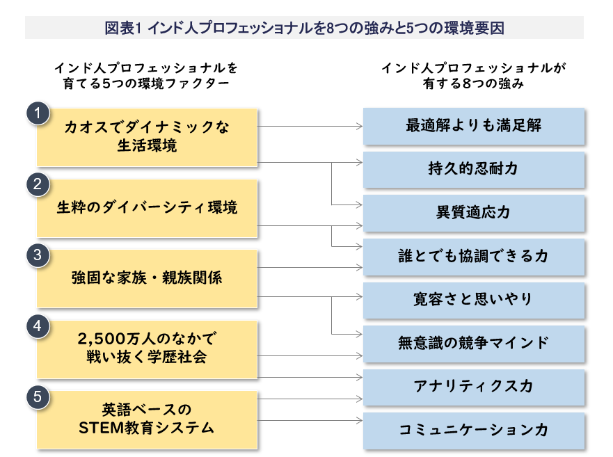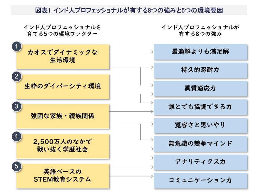 今回当社が実施したアンケート調査とインタビュー調査では、インド人プロフェッショナルが持つ5つのユニークなファクターと、8つの強みが浮かび上がってきました(図表1)。