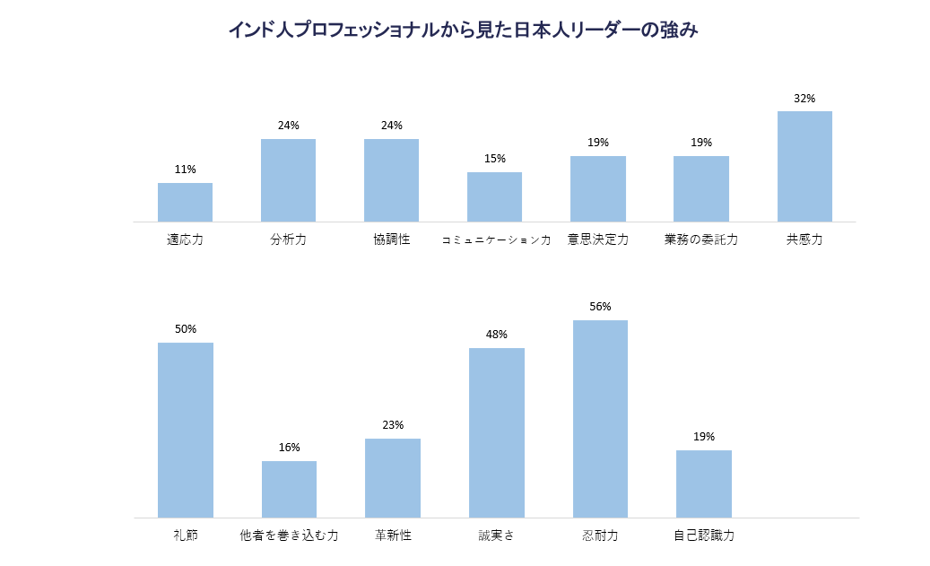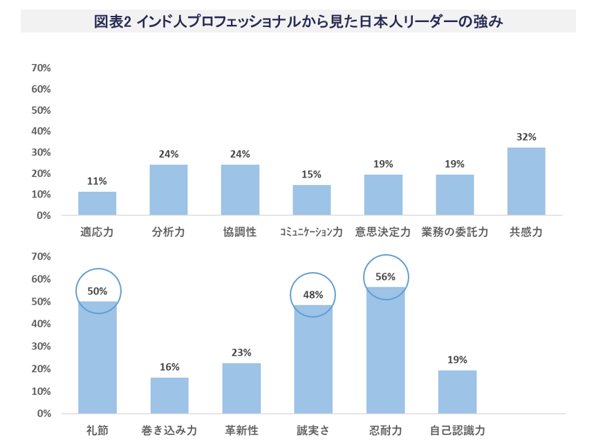 インド人プロフェッショナルは、日本人のリーダシップのうち、「礼節」「誠実さ」「忍耐力」を高く評価している(図表2)。勤勉な姿勢で働き、時間厳守やいわゆる“報連相”をまめに行う日本人リーダーは、部下に対するリスペクトが厚いと捉えられている。また、結果を追求し続ける忍耐力もプロフェッショナリズムとして高く評価されている。