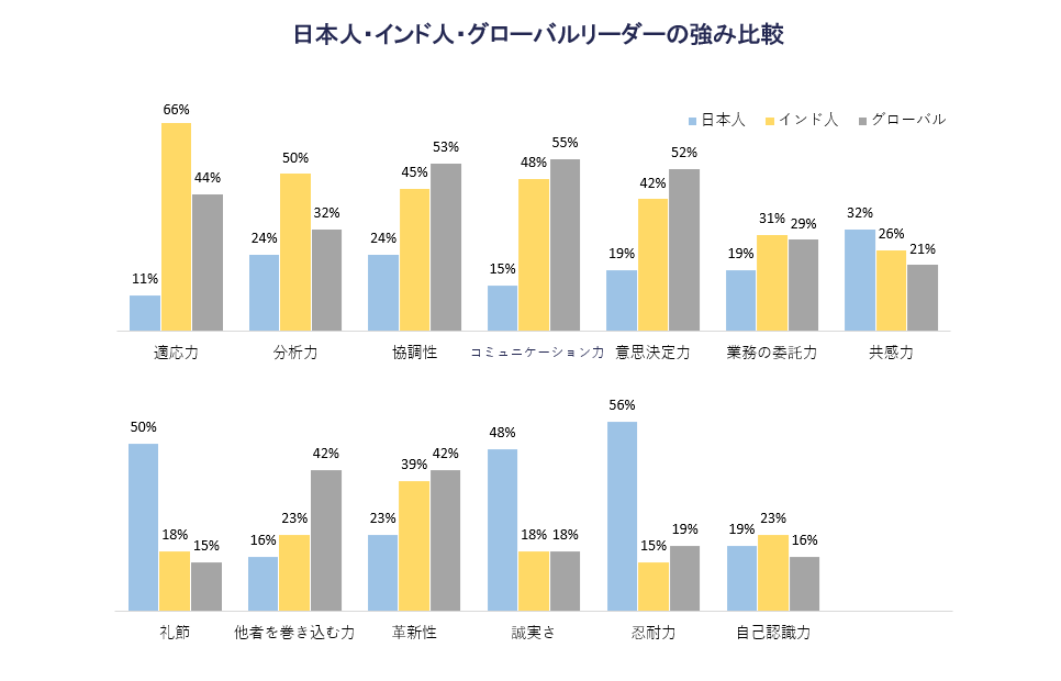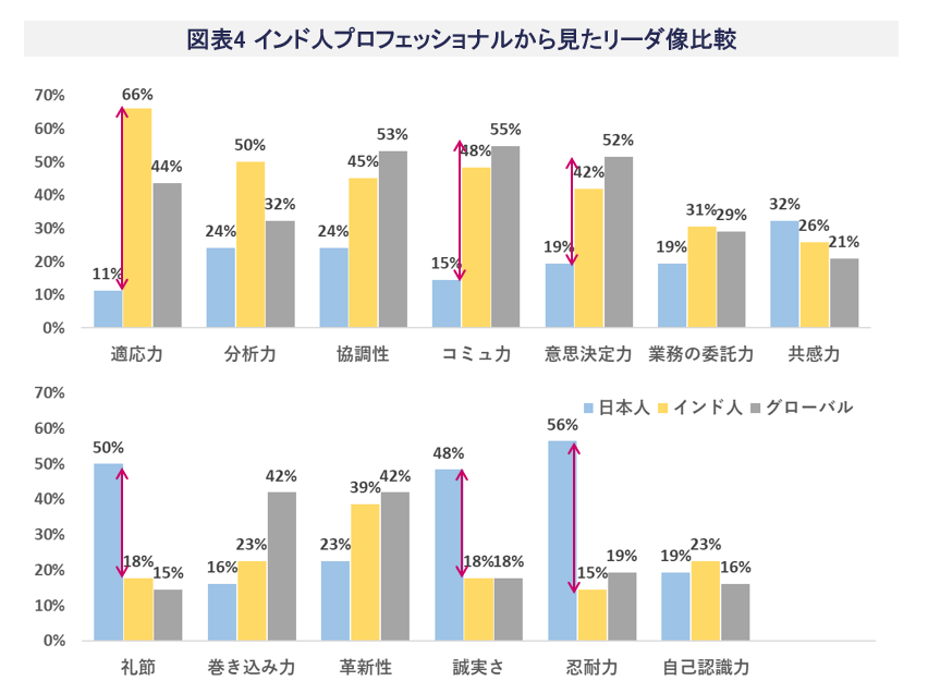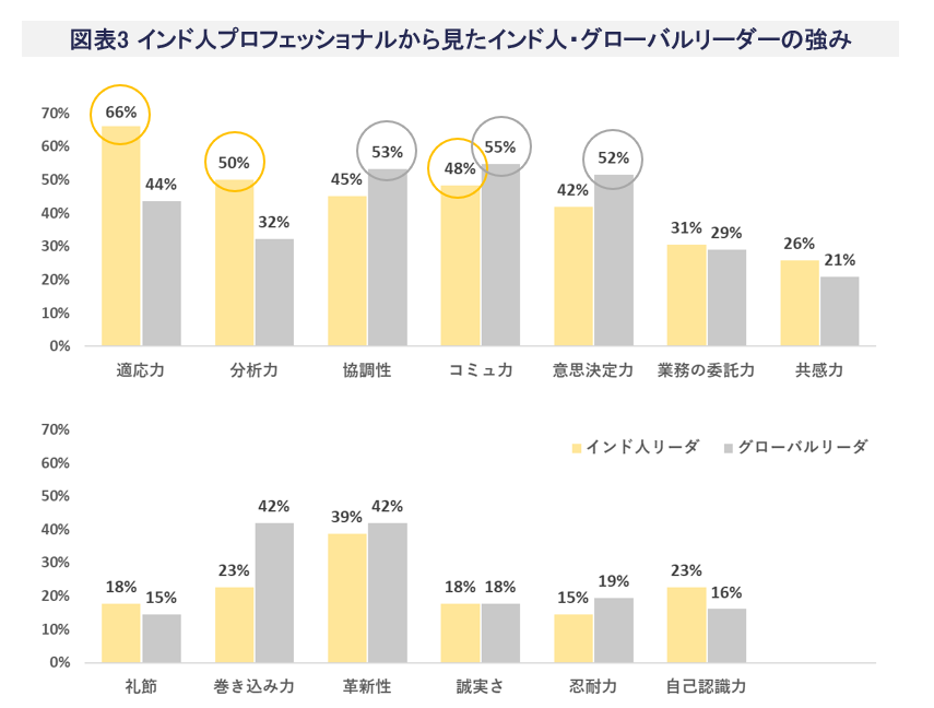 一方、インド人プロフェッショナルがインド人リーダー、グローバルリーダーのリーダシップのうち高く評価しているのは「適応力」「コミュニケーション力」「意思決定力」であった(図表3)。