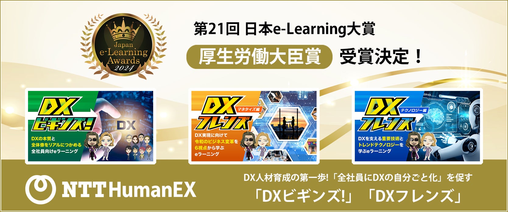 株式会社NTT HumanEX(本社:東京都港区、代表取締役社長:鳥越隆)が提供する、全社員にDXの自分ごと化を促すeラーニング「DXビギンズ!」 「DXフレンズ(テクノロジー編&マネタイズ編)」は、一般社団法人日本オンライン教育産業協会(東京都新宿区、代表理事会長:岸田徹氏)と株式会社産業経済新聞社(東京都千代田区、代表取締役社長:近藤哲司氏)が主催する「第21回日本e-Learning大賞」において厚生労働大臣賞を受賞しました。