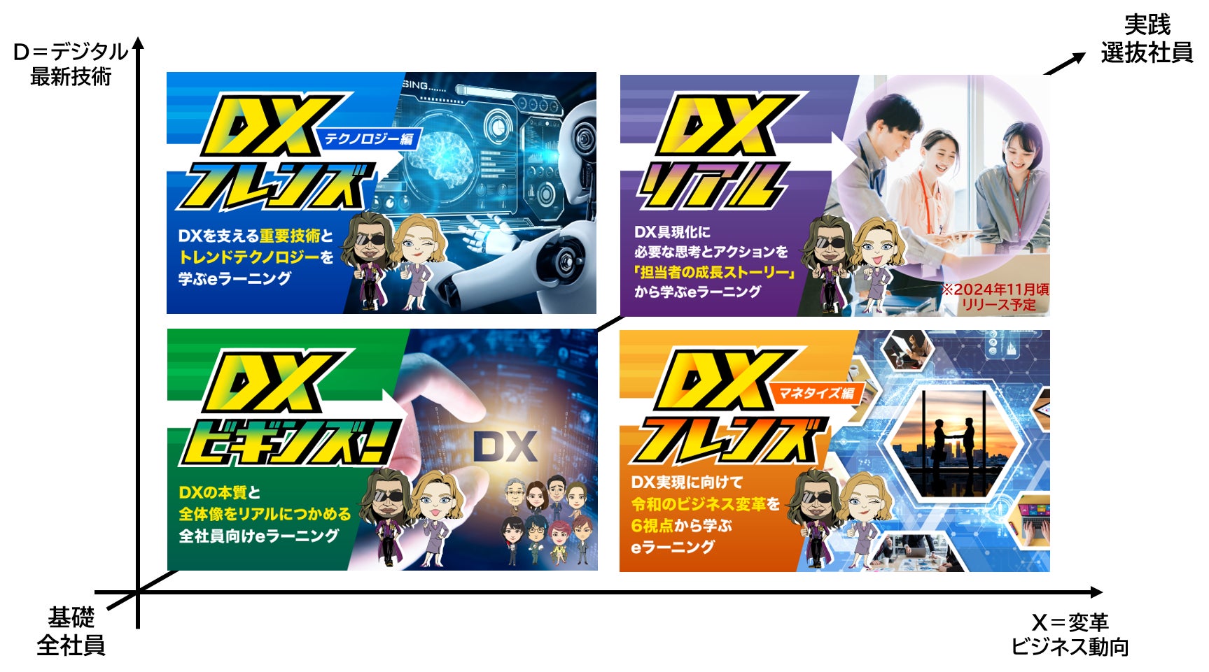 DX教育において市場で提供されている学習コンテンツの多くは、一部の技術者や推進者に向けた専門知識や技術面にのみ焦点を置いた内容であり、実務を担いDXを真に進める一般社員にはレベルが高く、「自身には関係のない難しいもの」です。そこで、「どんな内容であれば一般社員はDXを理解し共鳴するのか」「何を学べたら推進の一歩を踏み出せるのか」を考え、DXの概要や本質、進め方など全体像を学べる「DXビギンズ!」、そしてDXのD=デジタルやX=ビジネス変革のトレンドを学べる「DXフレンズ(テクノロジー編&マネタイズ編)」を順にリリースし、理解度を確認できる「DXリテラシー修了テスト」や、知識を職場実践につなげるeラーニング連動ワークショップを揃え、DXeラーニングシリーズとして進化を続けてきました。