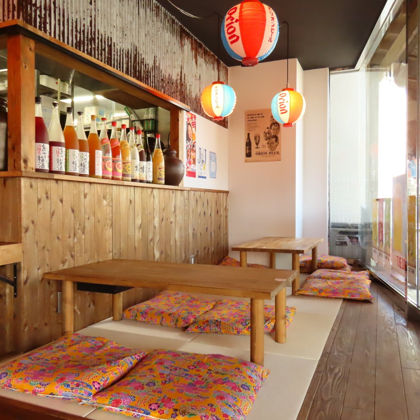 ”一番近い沖縄を”をテーマに、入口には50cmの特大シーサーがを設置。内装も首里城で使われている赤瓦や沖縄畳、オリオン提灯など沖縄の雰囲気を楽しめます。