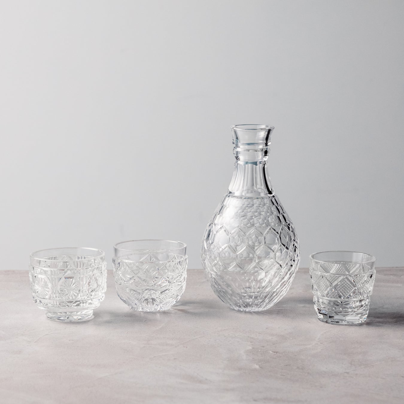 琥珀やオリーブなど独自色が特徴の匠から、薩摩切子では数少ない透明の徳利とぐい呑をご紹介します。銀座店ではドリンクの色を愉しめる透明のグラスを展開予定です。