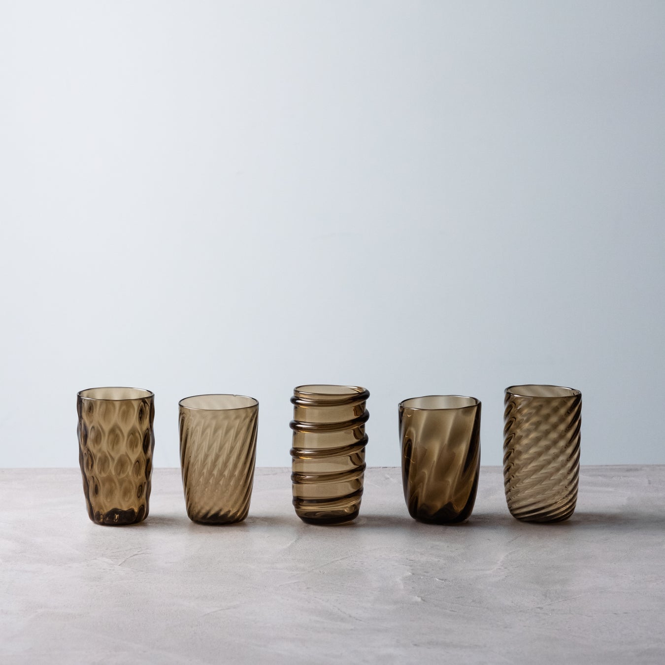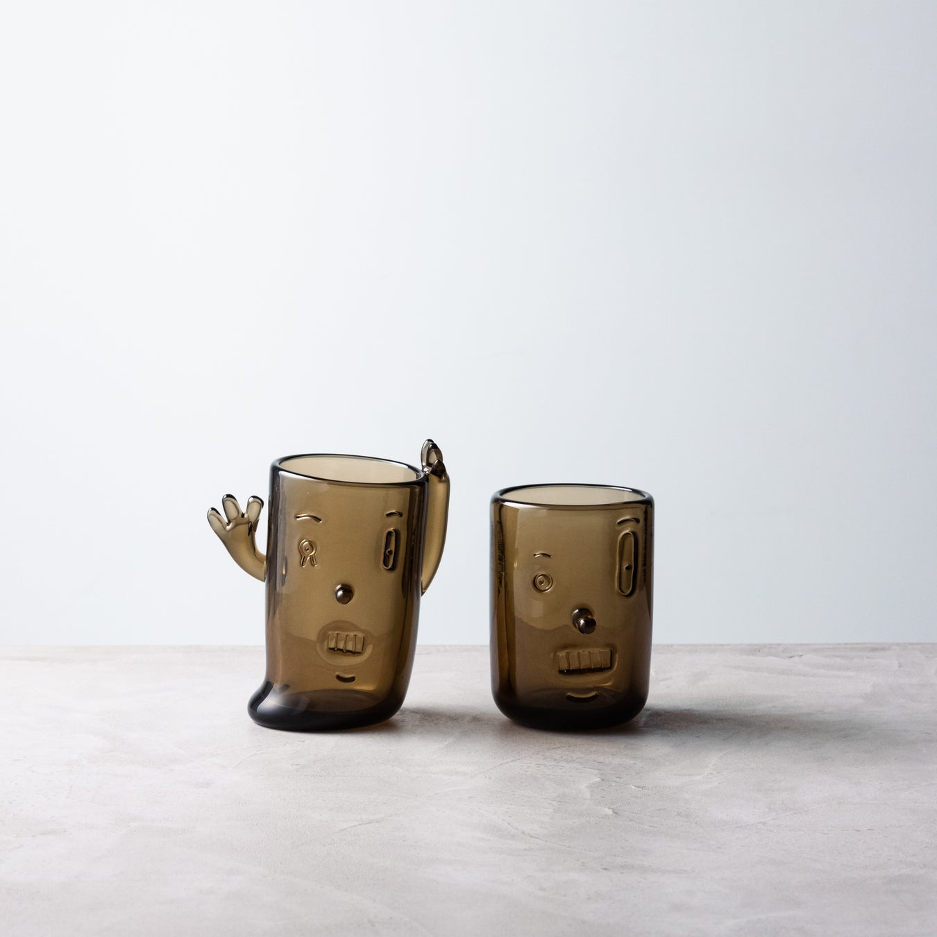 日常で使いやすい透明ガラスに加え、飴グレーのコップや鉢もご用意しました。ファンの方にも喜んでいただけるお馴染みのアイテムから一点ものまで幅広く紹介します。