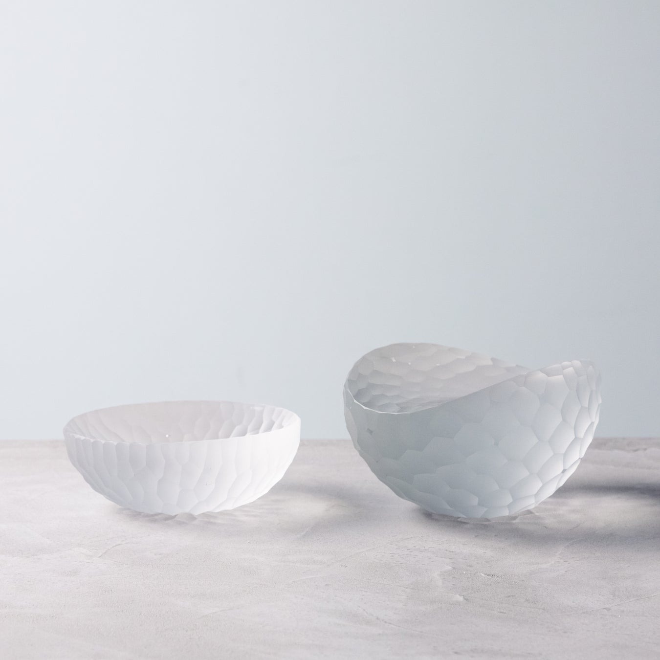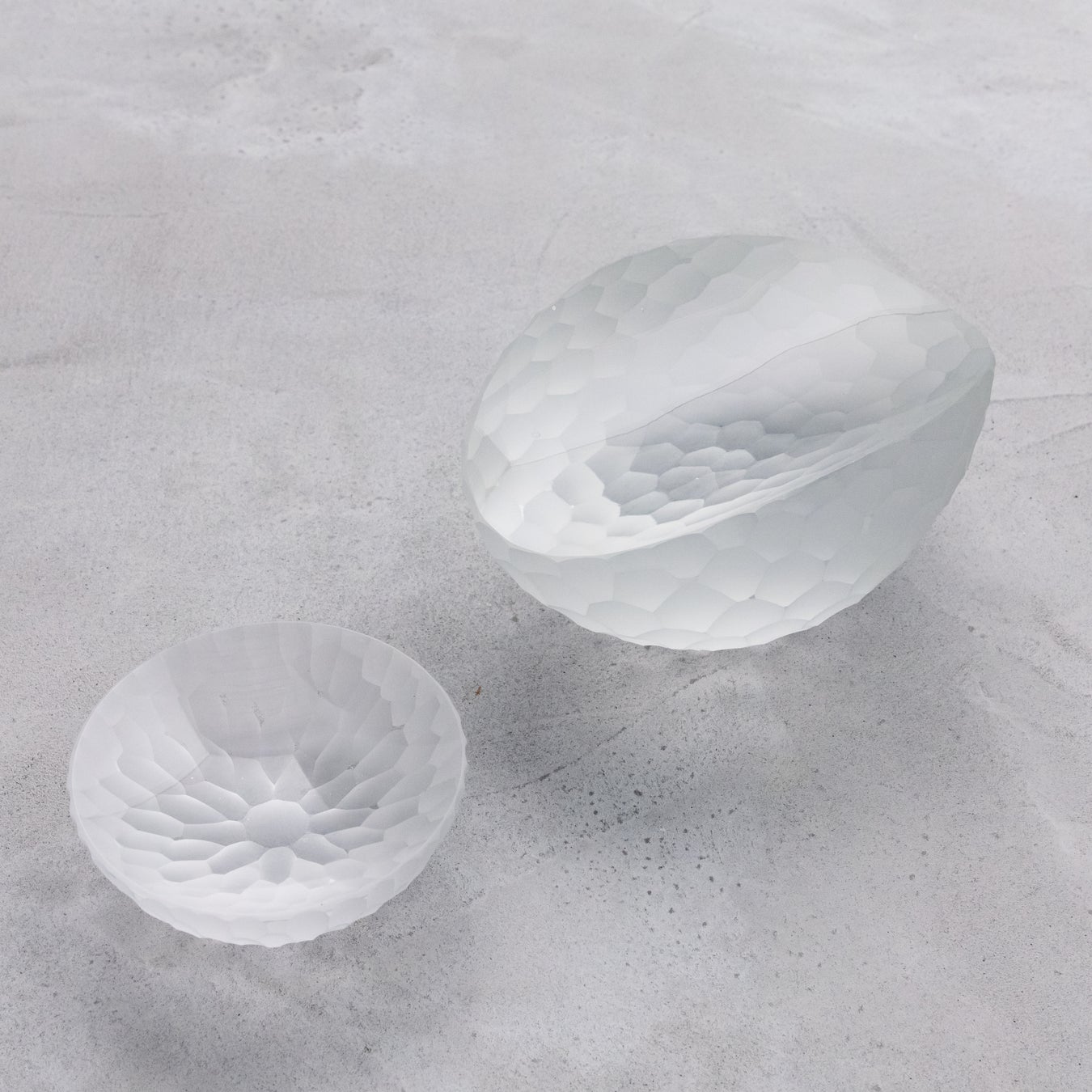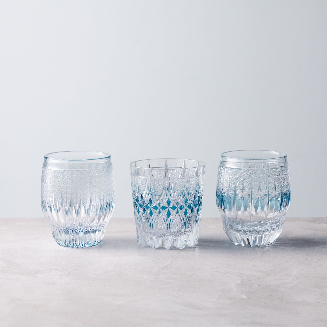 青い色被せガラスを贅沢にカットしたクリアガラスは「光の彫刻」のような輝きです。