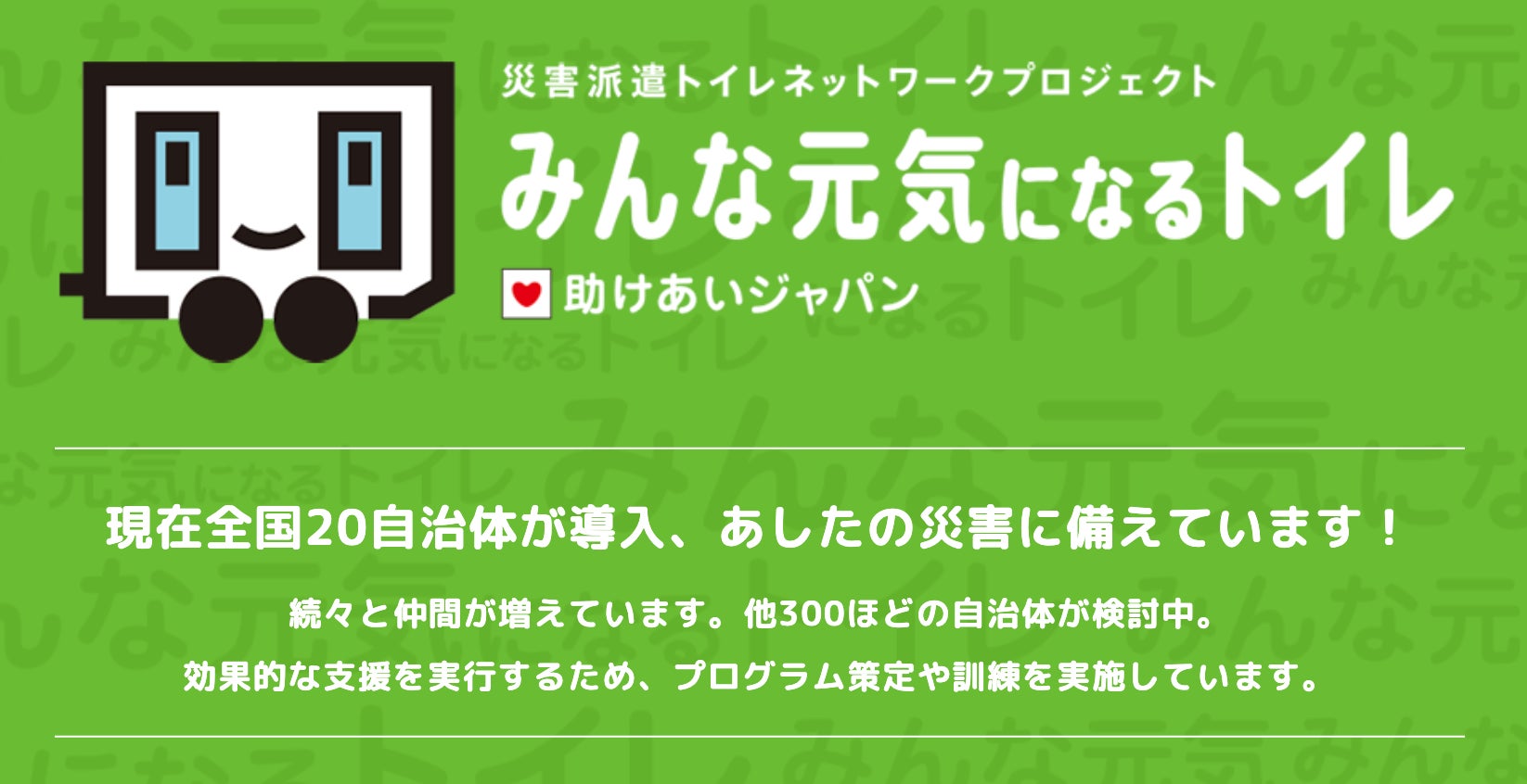 一般社団法人助けあいジャパンの災害支援トイレネットワークプロジェクト「みんな元気になるトイレ」は、安心・安全・清潔なトイレを被災自治体にお届けし、避難者・ボランティアなどトイレが使えない近隣住民・自衛隊や医療関係者などの支援のプロに使用いただき、排泄のストレスを感じることなく復興への道のりを支えるものです。一度出動すると短くて一月、長くて半年ほど無償貸与させていただいています。2018年プロジェクト発足以来、日本中多くの被災自治体へ出動支援をしてきました。